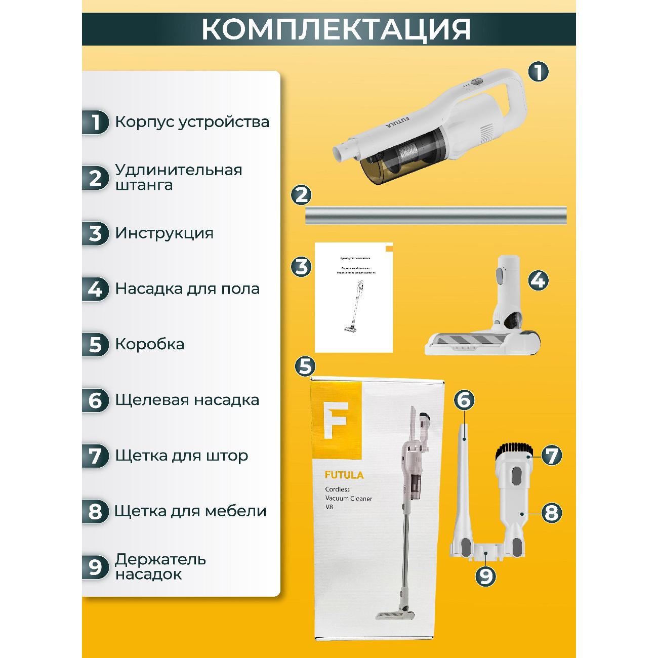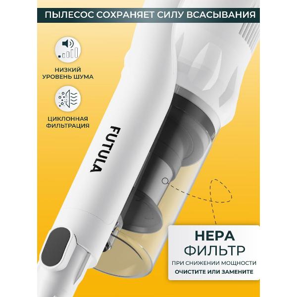 Ручной пылесос Futula V8 White оснащен двигателем мощностью 150 Вт с функцией плавного запуска. В режиме сухой уборки используются две скорости в зависимости от типа покрытия пола. За электропитание отвечает встроенный аккумулятор емкостью 2000 мА*ч, для полного заряда которого требуется 240 мин. Этого количества энергии достаточно для 30 мин беспрерывной работы. В качестве пылесборника используется контейнер с циклоническим фильтром, благодаря которому воздух движется по спирали, и под воздействием центробежной силы пыль сбивается в плотный комок.