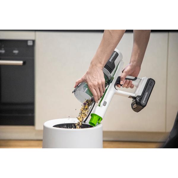 Greenworks G24SVK4D — вертикальный ручной пылесос с контейнером для пыли, размещенным сверху. Вместимость резервуара — 500 мл. Корпус выполнен из ударопрочного АБС-пластика, одноканальная трубка — из алюминия. Эта модель оборудована микрофильтром HEPA13.
