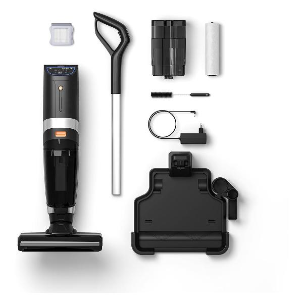 Максимальный уровень шума не превышает 72 дБ. В комплекте: один сменный пылесборник и станция зарядки. Корпус и цельная трубка выполнены из ударопрочного пластика, две щетки — из микроволокна. Хранение и транспортировку обеспечивают системы вертикальной и горизонтальной парковки и горизонтальная и вертикальная ручки. Вес модели составляет 7,5 кг. Габариты — 33х35х119 см.