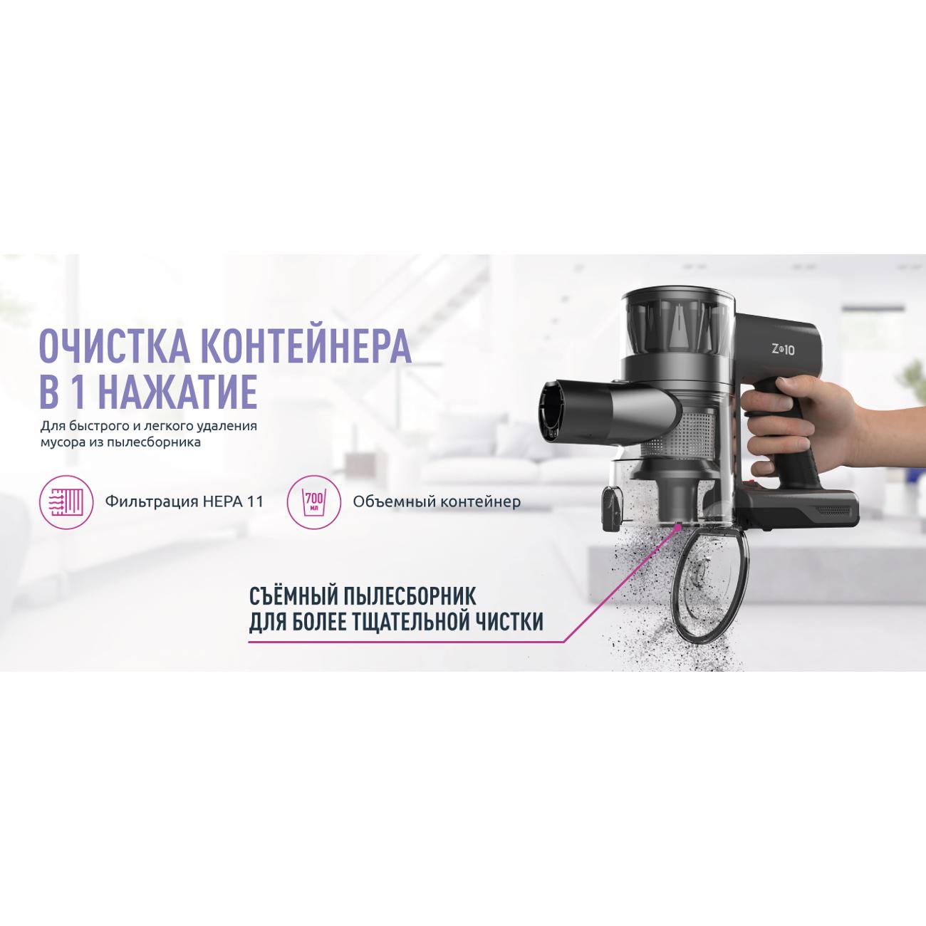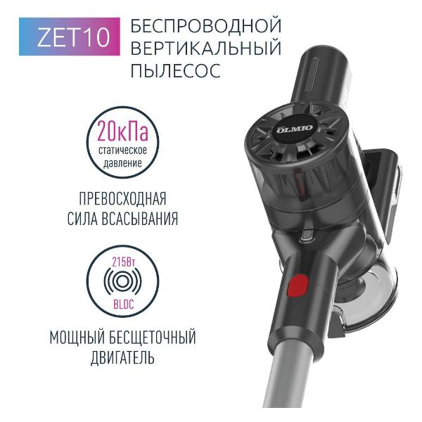 Ручной пылесос Olmio Zet 10 сделан из пластика и окрашен в графитовый цвет. Он работает от Li-Ion-аккумулятора емкостью 2200 мА*ч. Время беспрерывной работы составляет примерно 0,5 часа, время полной зарядки батареи аналогичное. Устройство функционирует в двух режимах: сухая и влажная уборка. Есть опция плавного запуска двигателя и вращения насадки. Зона уборки подсвечивается.