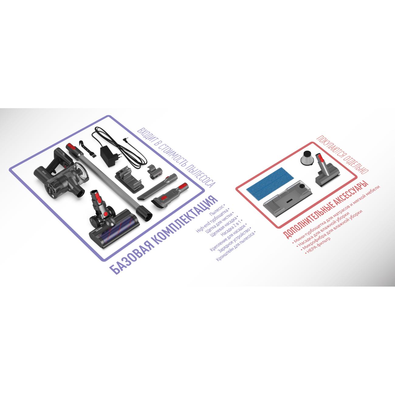 Пылесос оснащен микрофильтром класса HEPA. В комплекте есть насадка из микрофибры, выдвижная щелевая насадка, насадки для паркета мебели, ковров, сбора шерсти домашних животных. Управление пылесосом электронное. Есть индикаторы текущего уровня заряда аккумулятора и выбранного режима работы. Блок зарядки — в комплекте. Трубка изготовлена из алюминия.