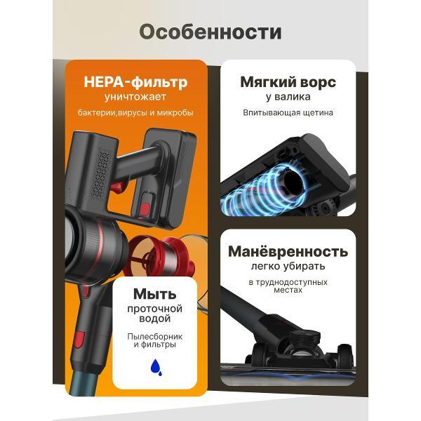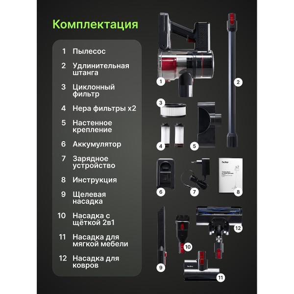 фильтр HEPA, циклон, 6-зонный циклон, сетчатый фильтр, фильтр HEPA под крышкой. Съемная штанга и различные насадки позволяют легко трансформировать пылесос вертикальный в ручной пылесос для уборки труднодоступных мест, автомобиля, а также очистки обивки диванов, матрасов и другой мягкой мебели. В комплект пылесоса входят 4 насадки, включая турбощетку для мебели + дополнительный HEPA фильтр, инструкция на русском языке. Возможно приобрести все комплектующие отдельно