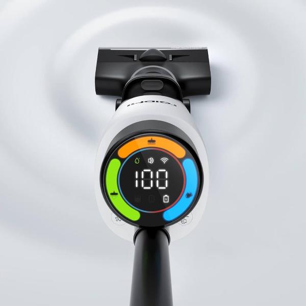 Объем резервуара для чистой воды составляет 720 мл, для грязной — 690 мл. Светодиодный экран сообщит о заполнении резервуаров, отсутствии воды, необходимости зарядки. Управлять пылесосом можно также со смартфона. Уровень шума при работе не превышает 78 дБ. Вес модели составляет 4,5 л.