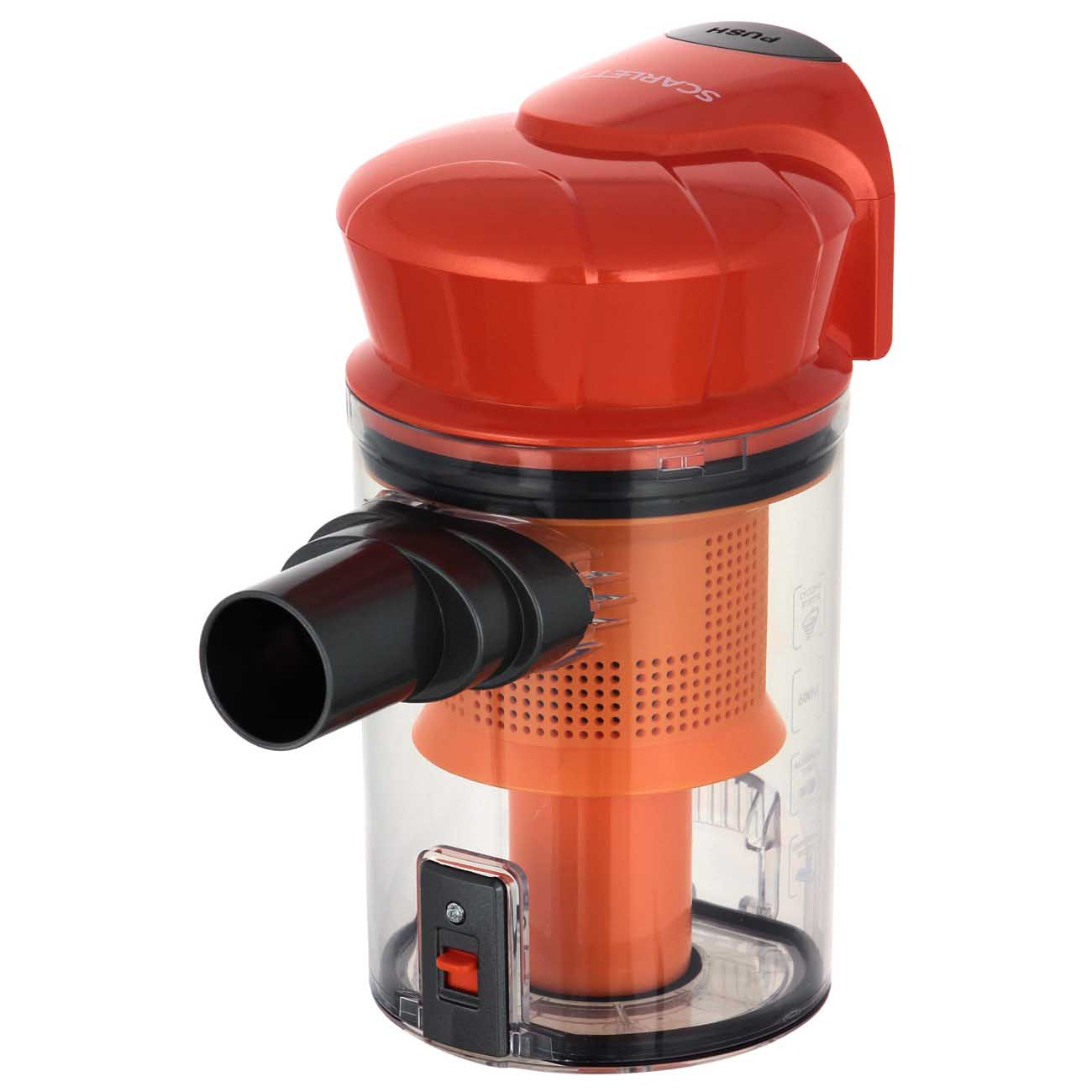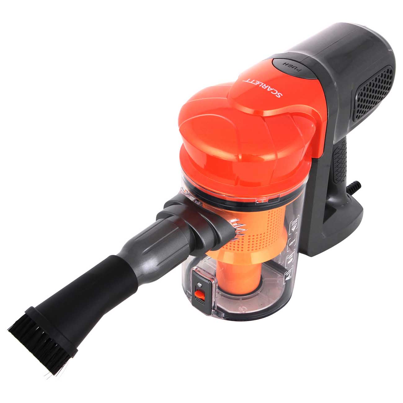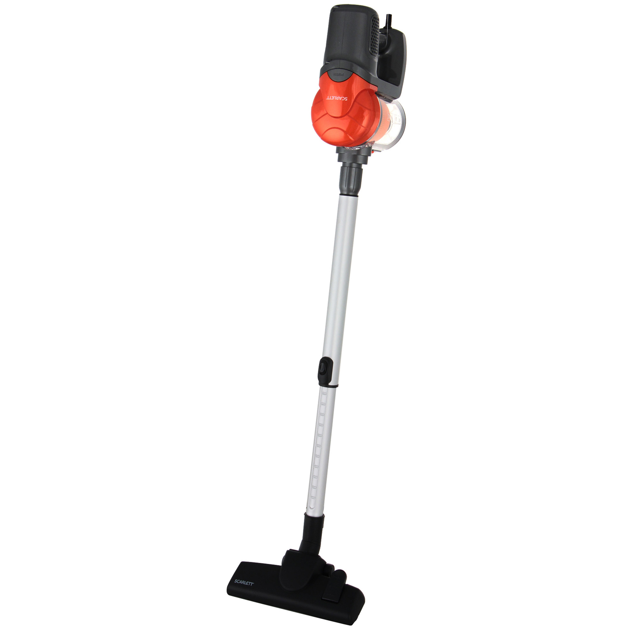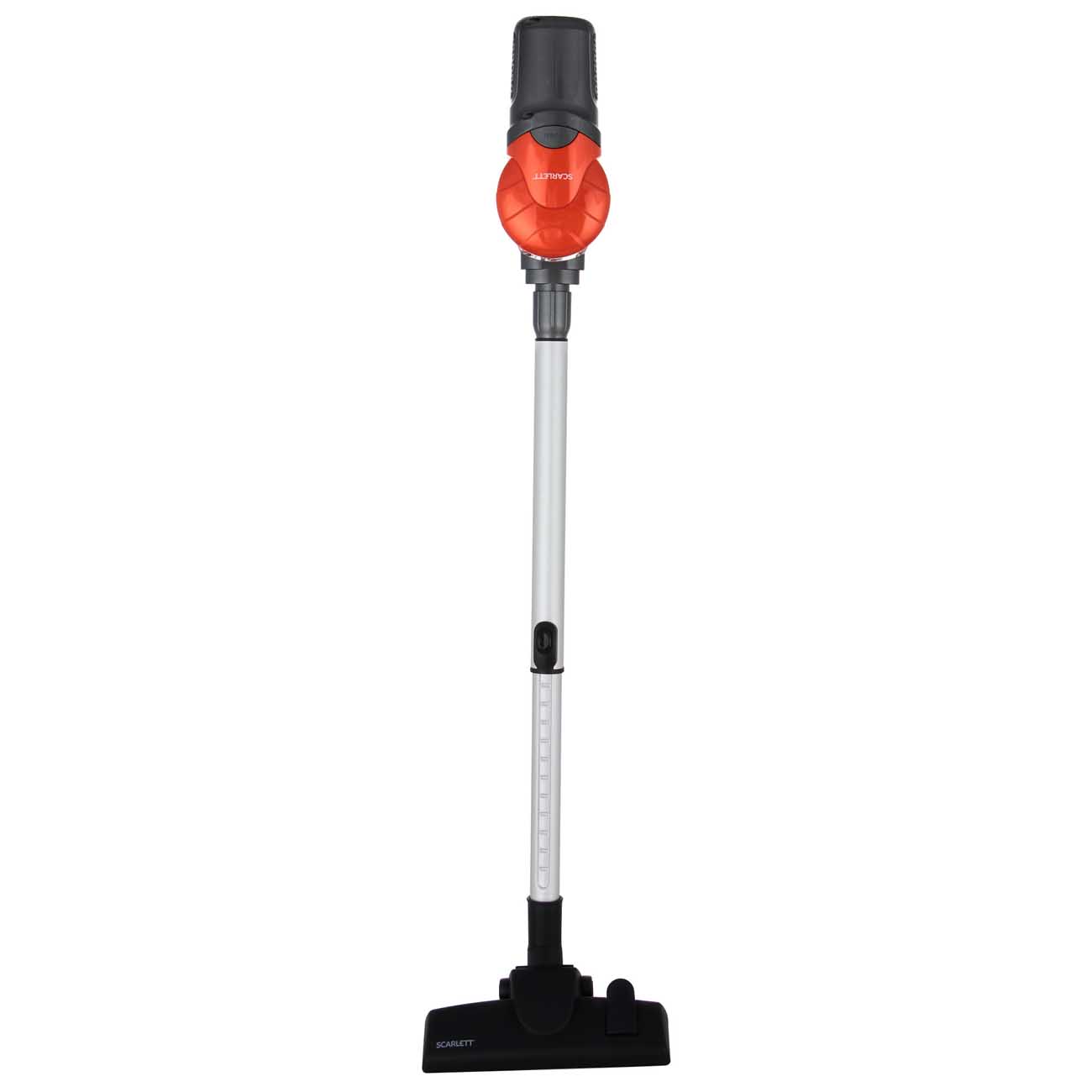 Кнопка управления удобно расположена на рукоятке. Scarlett SC-VC80H12 работает, когда вы удерживаете клавишу, и отключается – когда отпускаете. Это пригодится для небольших перерывов в уборке и позволит экономить время и электроэнергию.