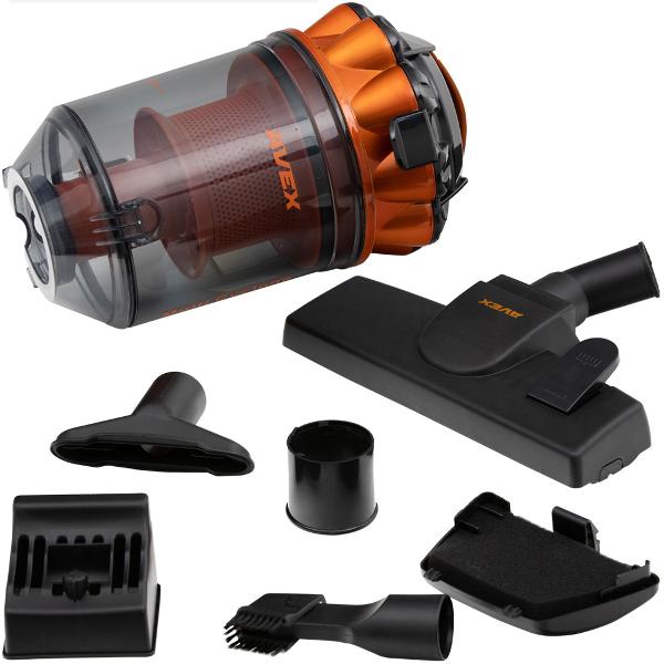 Пылесос с контейнером для пыли Avex VC-309 Orange выполняет сухую уборку и работает на основе циклонной технологии, объем пылесборника — 2,5 л. Бокс изготовлен из прозрачного пластика и оснащен ручкой — следить за его наполнением и очищать очень удобно. Максимальная мощность прибора — 1800 Вт, сила всасывания — 350 Вт. На трубке есть регулятор интенсивности потока.