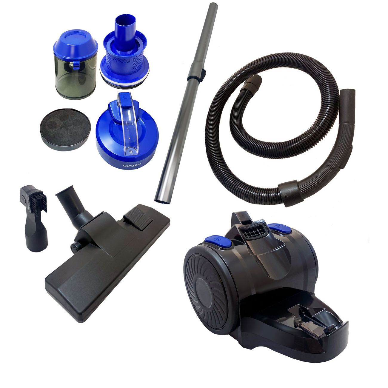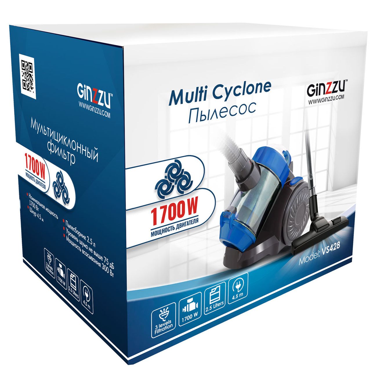 Пылесос с контейнером для пыли Ginzzu VS428 циклонный с тремя ступенями фильтрации эффективно очищает воздух, задерживая аллергены и бактерии.