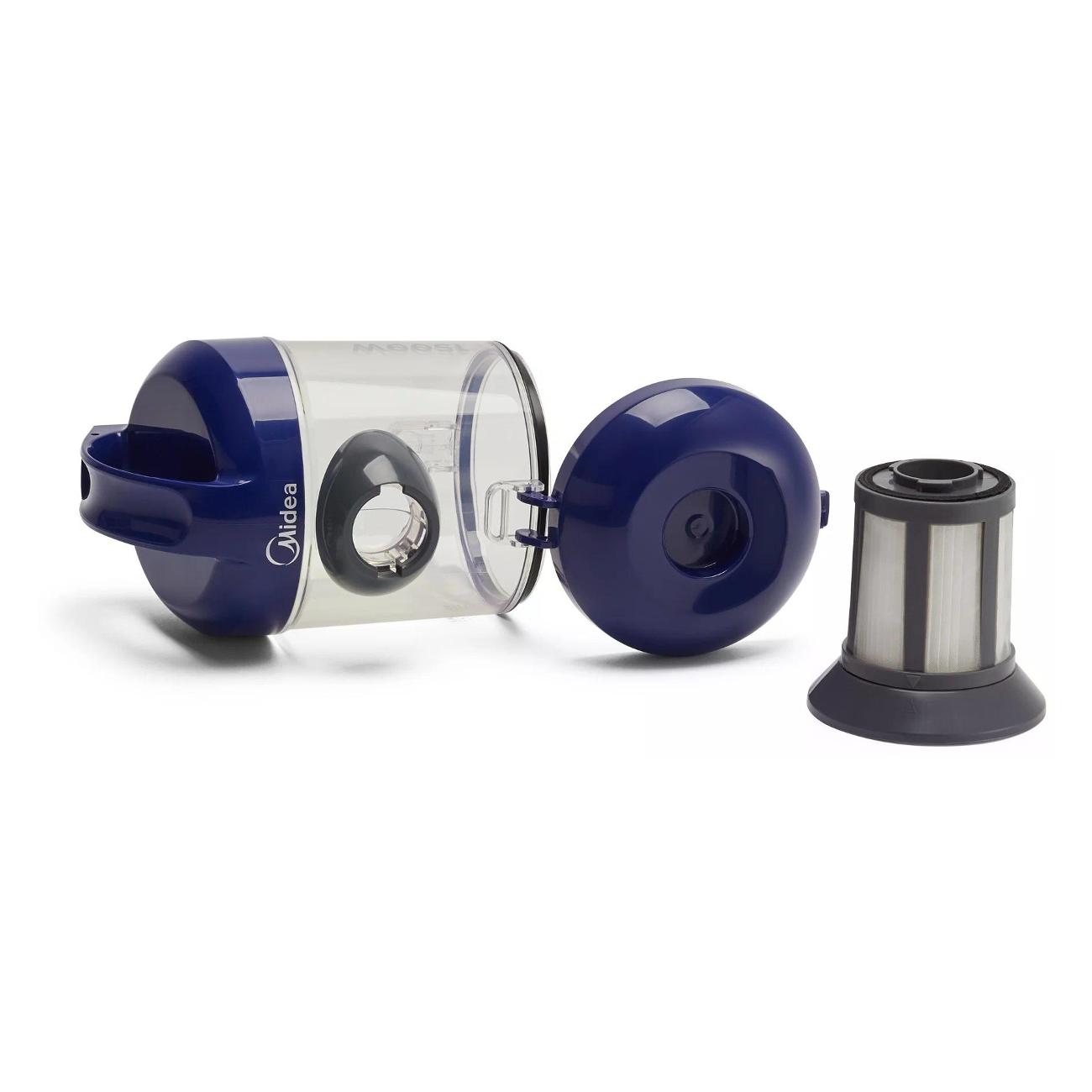 Пылесос с контейнером для пыли Midea VCC350B02 выполнен в компактном пластиковом корпусе синего и серого цвета. На корпусе расположены две кнопки по бокам, одна отвечает за включение рабочего режима пылесоса, другая — за автоматическое сматывание шнура питания.