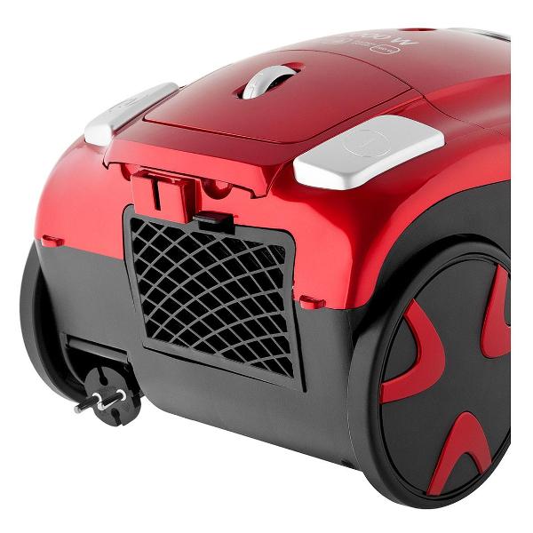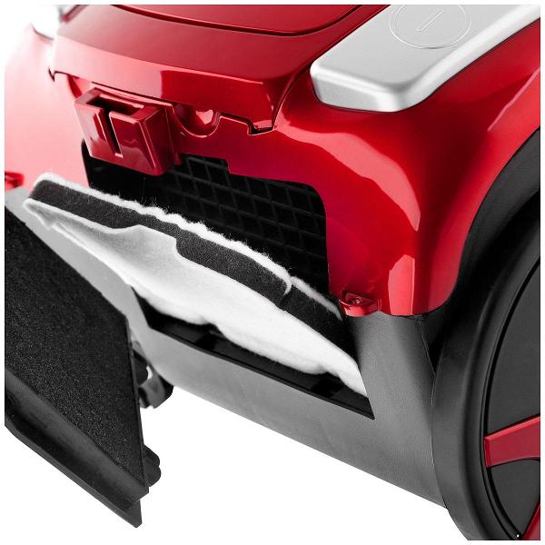 Мощность работы пылесоса можно отрегулировать с помощью кнопок на корпусе. Шнур длиной 5 м позволяет использовать устройство на большом расстоянии от розетки. Кабель автоматически сматывается. Двигатель отличается долгим эксплуатационным сроком, так как дополнен фильтром. Прибор можно хранить как в вертикальном, так и горизонтальном положении. Поворачивающиеся колеса позволяют легко перемещать модель.