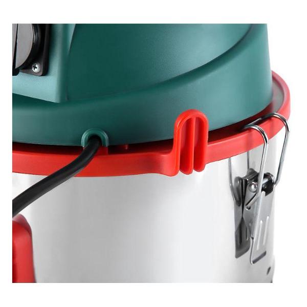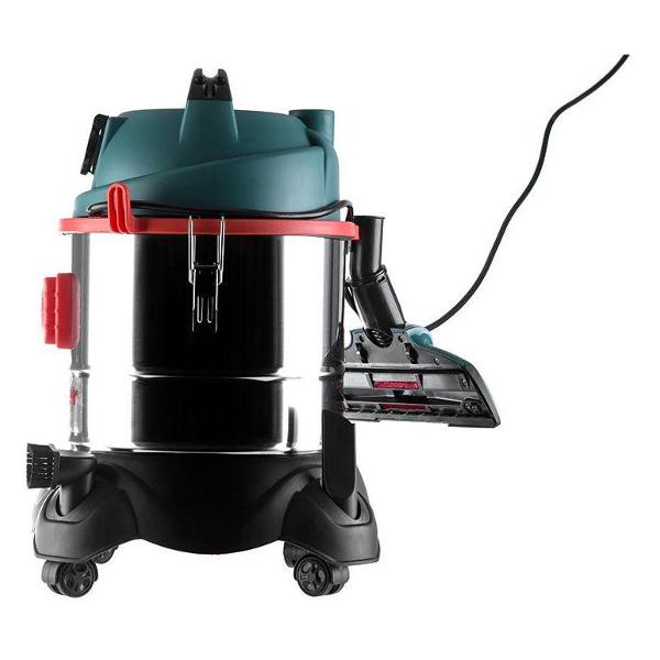 Длина сетевого кабеля — 7 м, всасывающего шланга — 3 м. Его диаметр 32 мм. Безопасность и защиту от удара током обеспечивает заземление при помощи цепочки. Корпус, выполненный из нержавеющей связи, ударопрочный и устойчивый к коррозии. Для удобства перемещения установлены поворотные колесики, для переноса — ручка. Пылесос весит 5,75 кг, габариты: 48х38,5х38,5 см.