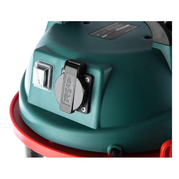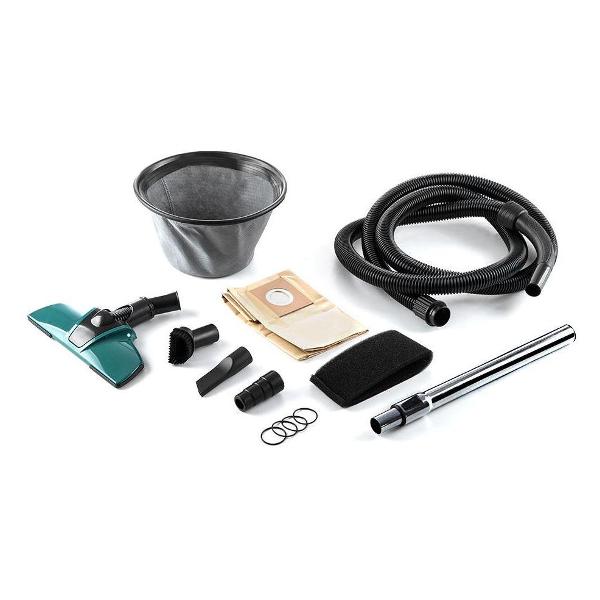 Пылесос оснащен розеткой с поддержкой функции синхростарта, с помощью которой можно подключить электроинструмент. В комплект входят три насадки: для пола, узкая для чистки швов и полукруглая ворсовая — для мебели. Для хранения аксессуаров в основании прибора предусмотрены выемки.