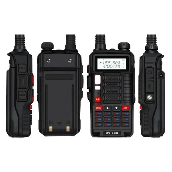 Рация Baofeng UV-10R 10W осуществляет передачу сигнала в диапазоне 128 каналов на рабочей частоте 136–174 МГц и 400–520 МГц. Дальность действия на открытом пространстве достигает показателя 12 км, в пределах помещения — 2500 м. За электропитание отвечает встроенный литиево-ионный аккумулятор емкостью 2200 мА*ч. В качестве механизма запуска используется голосовая активация. Предусмотрена возможность регулировки мощности и громкости. Устройство оснащено функциями автоматического отключения, активного шумоподавления, монитора и звукового нажатия клавиш.