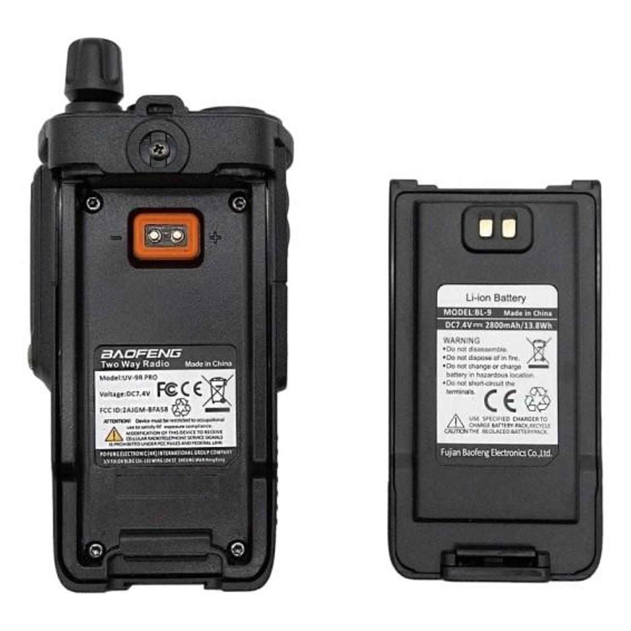 Рация Baofeng UV-9R PRO V2 осуществляет передачу сигнала в диапазоне 128 каналов на рабочей частоте 136–174 МГц и 400–520 МГц. Дальность действия на открытом пространстве достигает показателя 10 км, в пределах помещения — 2000 м. За электропитание отвечает встроенный литиево-ионный аккумулятор емкостью 2800 мА*ч. В качестве механизма запуска используется голосовая активация. Предусмотрена возможность регулировки мощности и громкости. Устройство оснащено функциями автоматического отключения, активного шумоподавления, монитора и звукового нажатия клавиш.