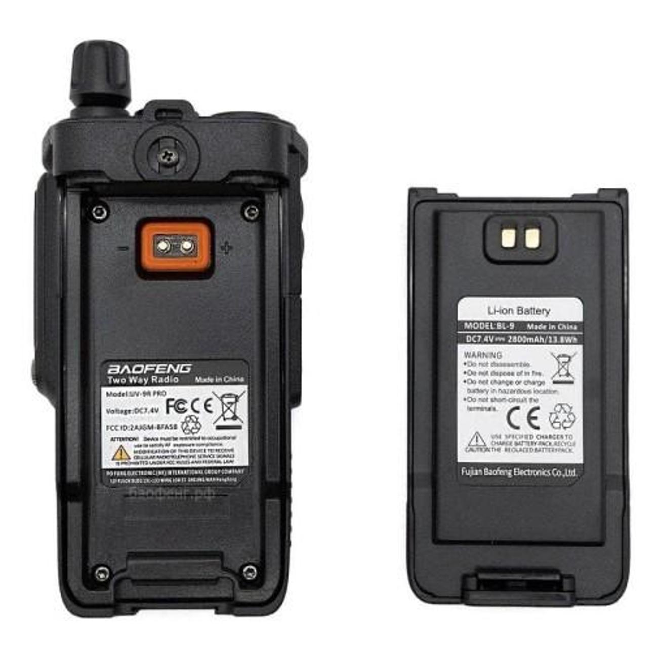 Рация Baofeng UV-9R PRO V2 осуществляет передачу сигнала в диапазоне 128 каналов на рабочей частоте 136–174 МГц и 400–520 МГц. Дальность действия на открытом пространстве достигает показателя 10 км, в пределах помещения — 2000 м. За электропитание отвечает встроенный литиево-ионный аккумулятор емкостью 2800 мА*ч. В качестве механизма запуска используется голосовая активация. Предусмотрена возможность регулировки мощности и громкости. Устройство оснащено функциями автоматического отключения, активного шумоподавления, монитора и звукового нажатия клавиш.