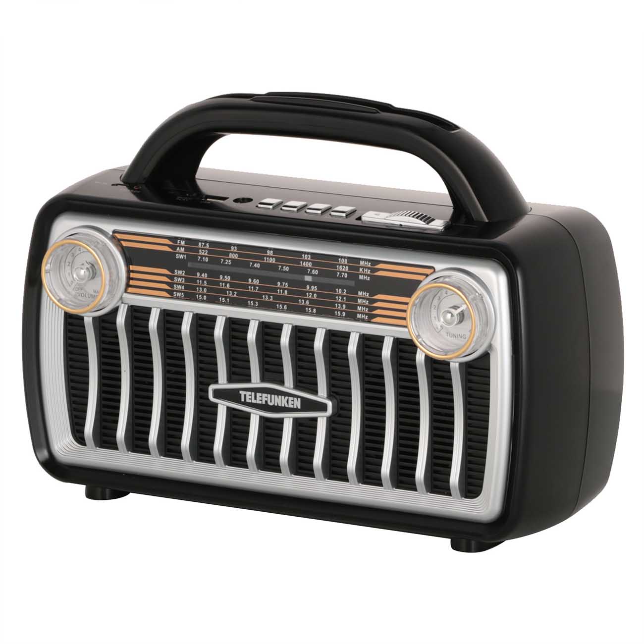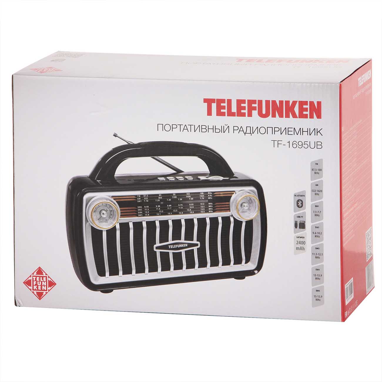 Радиоприемник Telefunken TF-1695UB с телескопической антенной работает как от сети 220 В, так и за счет встроенного литий-ионного аккумулятора. Его емкость равна 2400 мА*ч, чего достаточно для 10 часов автономного функционирования. В комплектацию входит зарядное устройство. Корпус размером 215 х 215 х 135 мм и весом 1340 г выполнен в винтажном стиле из высокопрочного пластика.