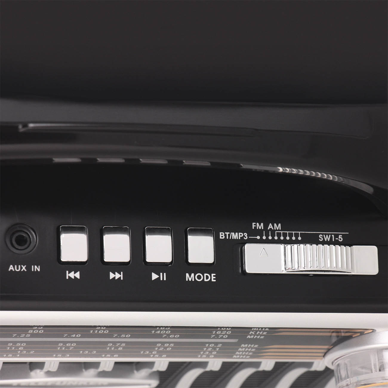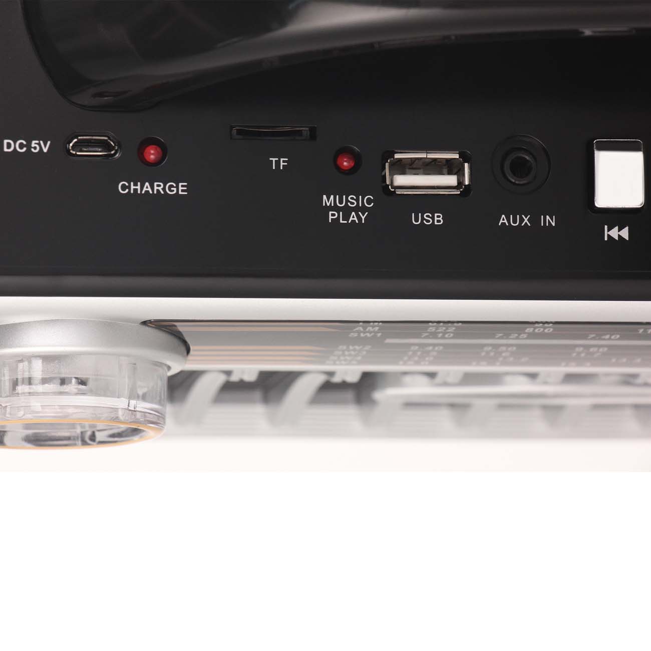 Аналоговый тюнер обеспечивает улавливание сигналов FM, AM и SW в частотном диапазоне от 7,1 до 1620 МГц. Также предусмотрено воспроизведение файлов со сторонних носителей благодаря интерфейсам Bluetooth, USB, AUX и слоту для чтения карт microSD с максимальным объемом, равным 128 Гб. Наличие аудиовыхода 3,5 мм позволяет подключать наушники. Управление осуществляется посредством поворотных переключателей и кнопочного блока.