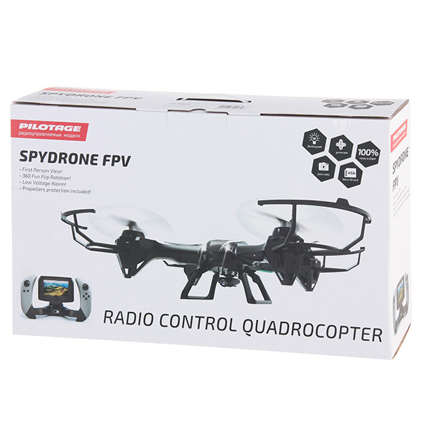 Радиоуправляемый квадрокоптер Pilotage Spydrone FPV имеет лёгкую конструкцию и оснащается экономичными электромоторами. Благодаря этому он может удерживаться в воздухе до 7 минут, передвигаясь с высокой скоростью. При этом устройство способно удаляться от пульта на расстояние до 30 метров.