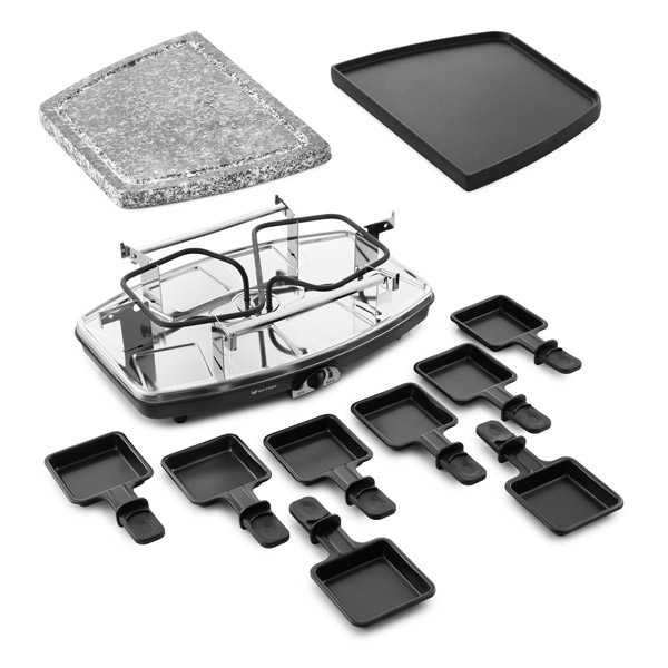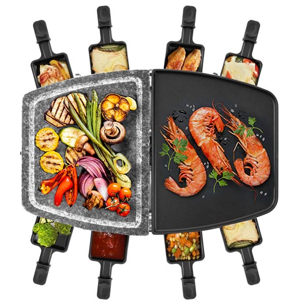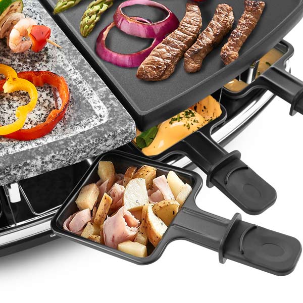 Раклетница Kitfort КТ-1649 оборудована комбинированной рабочей панелью: металлической с антипригарным покрытием и каменной. В комплекте — восемь мини-сковородок, устанавливаемых на нижний ярус. Все элементы съемные, очищаются под краном с помощью неабразивных средств и губки.