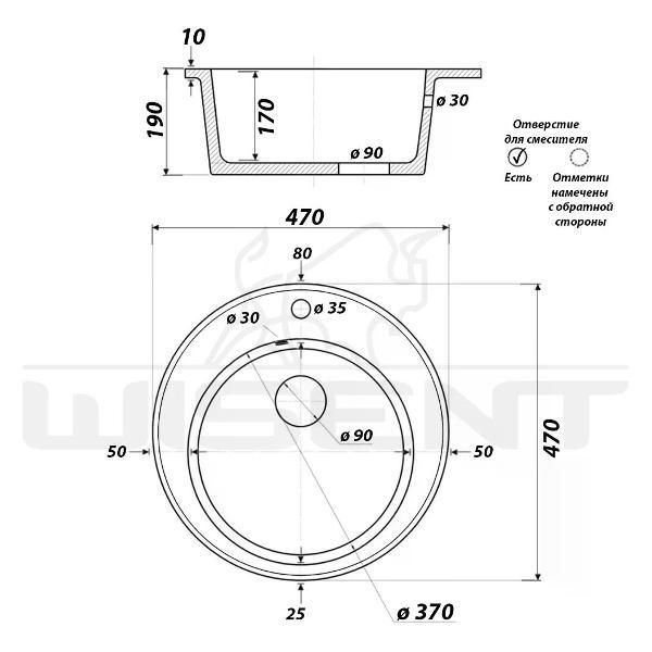 Размер мойки: 470×470×190 мм (допуск ±5 мм)
