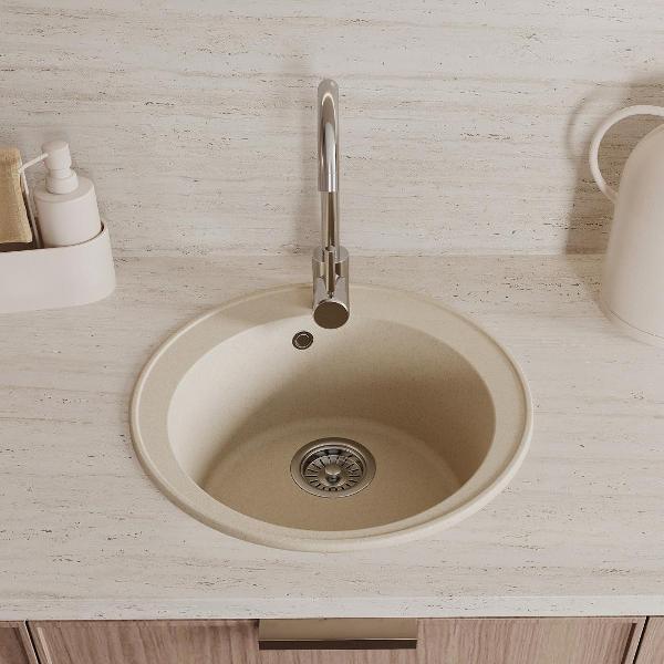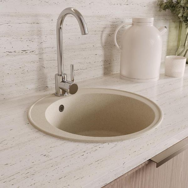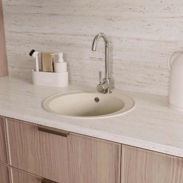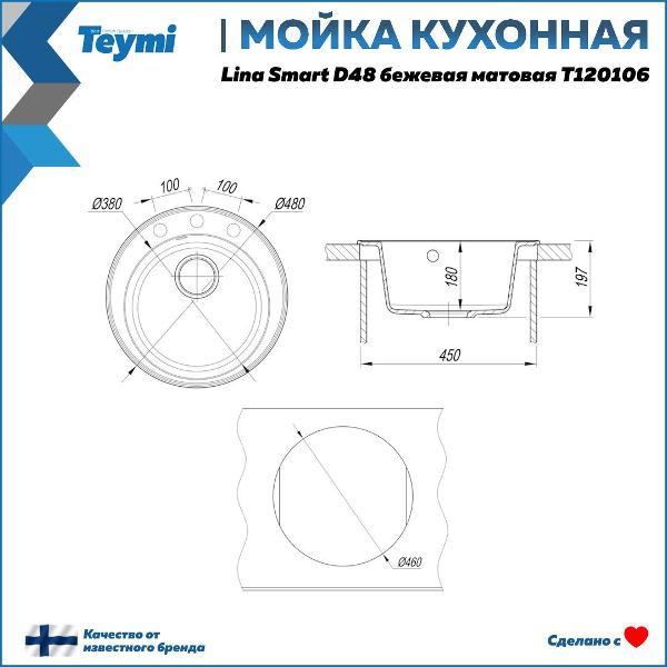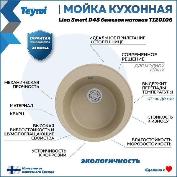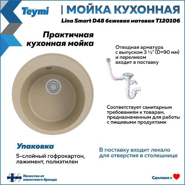Мойка для кухни D48 круглая бежевая матовая Teymi Lina Smart T120106 — это стильное и практичное решение для современной кухни. Основу материала моек Teymi составляет кварцевый песок 80% и полиэфирная смола 20%. Материал однороден по всей глубине мойки без верхнего покрытия. В структуру материала введены специальные антибактериальные защитные комплексы на основе серебра. В результате этого свежесть и гигиена рабочей поверхности сохраняются на протяжении всего срока службы мойки. Врезная модель диаметром 48 см обеспечивает удобство монтажа и надёжную фиксацию в столешнице. Благодаря глубокой чаше (18 см) удобно мыть даже габаритную посуду, а матовая поверхность подчёркивает современный стиль оформления и легко очищается. Отсутствие крыла делает конструкцию компактной, оставляя больше рабочего пространства. Эта кухонная мойка Teymi оснащена всем необходимым: в комплект входят сифон, лекало для выреза и паспорт изделия. Установка не требует специальных навыков, а минимальный размер тумбы — 540 мм, что делает модель универсальной для большинства гарнитуров. Преимущества Teymi Lina Smart D48: -- Современный лаконичный дизайн; -- Устойчивость к влаге и температурным перепадам; -- Гладкая поверхность не впитывает загрязнения; -- Простота установки и ухода; -- Гарантия производителя — 2 года. Приобретая товар Teymi Lina, Вы получаете качественное, современное, стильное изделие со сроком службы более 10 лет по доступной цене! Комплектация: Мойка, сифон, лекало для столешницы, паспорт. Упаковка: пятислойный белый гофрокартон и пупырчатая пленка.