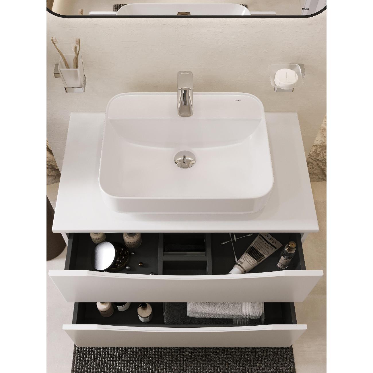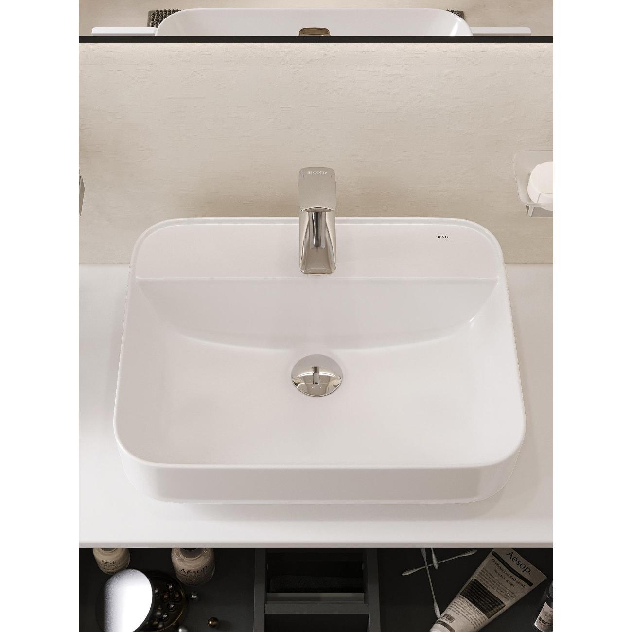 Раковина накладная прямоугольная 50*40*13,5см белая BOND Cube S13-500 с закругленными углами и отверстием под смеситель имеет стильный дизайн и отлично смотрится в современном интерьере ванной комнаты. Раковина-чаша изготовлена из высококачественного сантехнического фарфора, покрытого утолщенным слоем стекловидной глазури, которая защищает поверхность от скапливания бактерий и выцветания, придает ей блеск и обеспечивает очень легкий уход за ней. Раковина прямоугольная с закругленными углами, ее внешняя обтекаемая форма не позволяет накапливаться пыли. Прекрасно сочетается с различными стилями интерьера и будет радовать Вас долгие годы. К данной раковине подходят донные клапаны без перелива BOND BV0100 или BV0105.