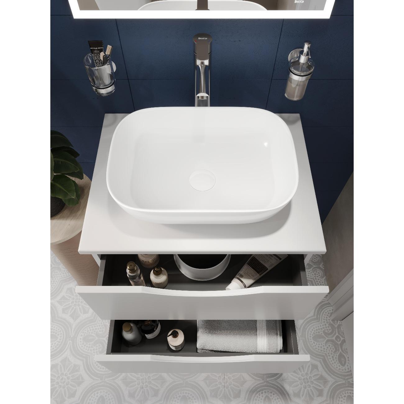 Раковина накладная прямоугольная 45,5*32,5*13,5см белая BOND Cube S54-450 с закругленными углами без перелива и отверстия под смеситель имеет стильный дизайн и отлично смотрится в современном интерьере ванной комнаты. Раковина-чаша изготовлена из высококачественного сантехнического фарфора, покрытого утолщенным слоем стекловидной глазури, которая защищает поверхность от скапливания бактерий и выцветания, придает ей блеск и обеспечивает очень легкий уход за ней. Раковина прямоугольная с закругленными углами, ее внешняя обтекаемая форма не позволяет накапливаться пыли. Прекрасно сочетается с различными стилями интерьера и будет радовать Вас долгие годы. К данной раковине подходят донные клапаны без перелива BOND BV0100, BV0105 и BV0188.