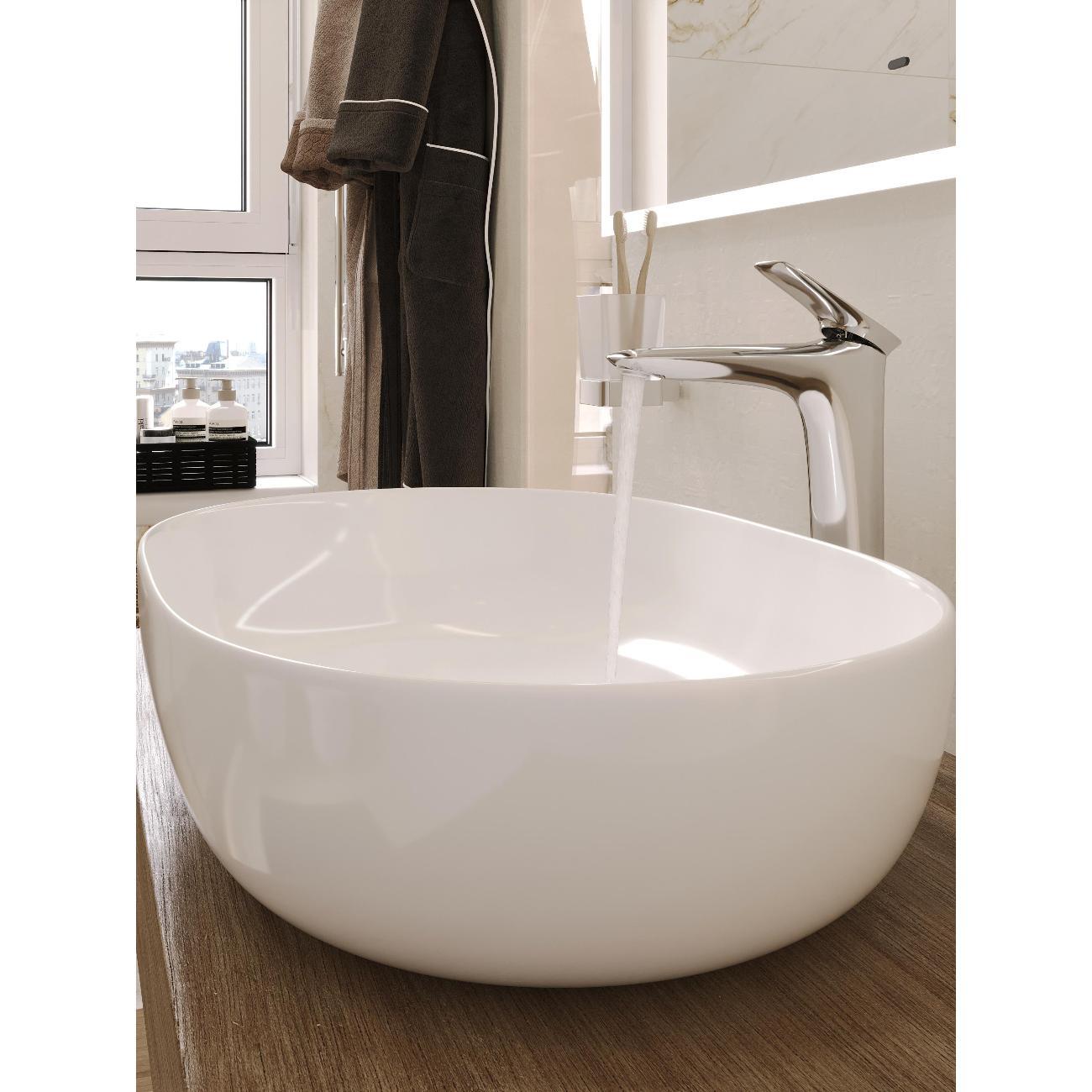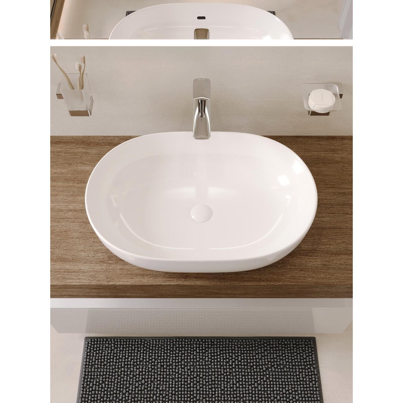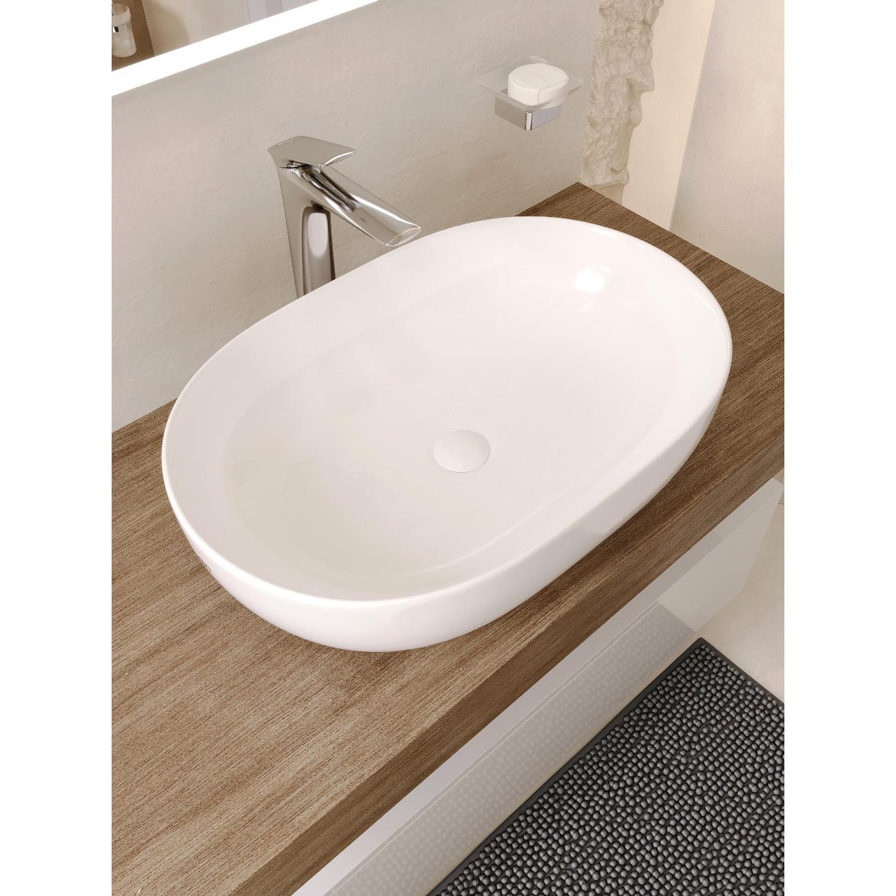 Раковина накладная овальная 60*41,5*15см белая BOND Oval S59-600 без отверстия под смеситель имеет стильный дизайн и отлично смотрится в современном интерьере ванной комнаты. Раковина-чаша изготовлена из высококачественного сантехнического фарфора, покрытого утолщенным слоем стекловидной глазури, которая защищает поверхность от скапливания бактерий и выцветания, придает ей блеск и обеспечивает очень легкий уход за ней. Раковина овальная, ее внешняя обтекаемая форма не позволяет накапливаться пыли. Прекрасно сочетается с различными стилями интерьера и будет радовать Вас долгие годы. К данной раковине подходят донные клапаны без перелива BOND BV0100, BV0105 и BV0188.