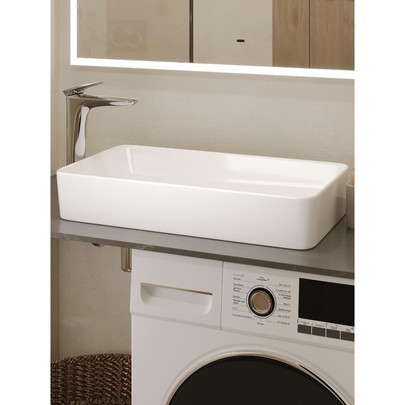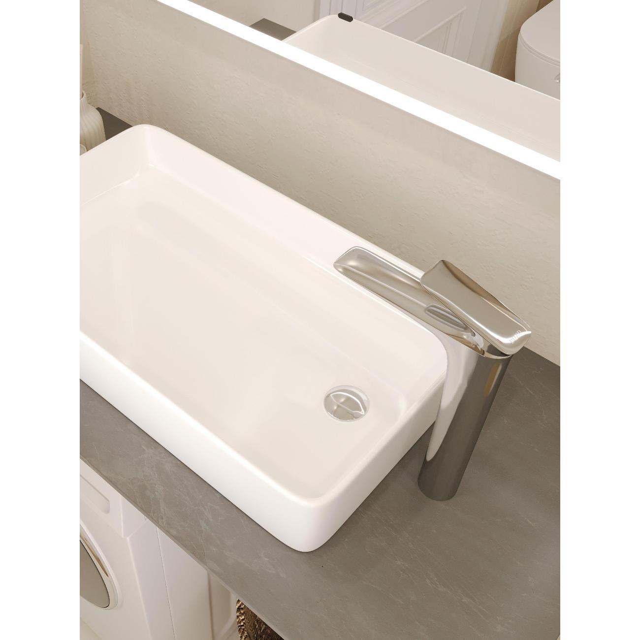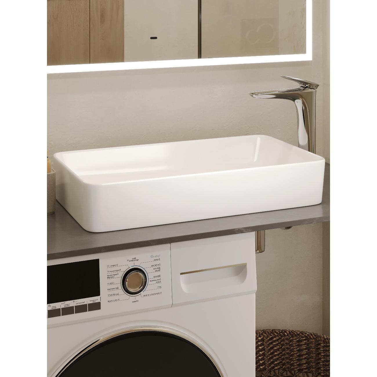 Раковина накладная прямоугольная 61,5*34,5*11,5см без перелива белая BOND Cube S67-610 без отверстия под смеситель имеет стильный дизайн и отлично смотрится в современном интерьере ванной комнаты. Раковина-чаша изготовлена из высококачественного сантехнического фарфора, покрытого утолщенным слоем стекловидной глазури, которая защищает поверхность от скапливания бактерий и выцветания, придает ей блеск и обеспечивает очень легкий уход за ней. Сливное отверстие расположено не в центре изделия, а ближе к одному из торцов, вы можете установить раковину, расположив слив с удобной для Вас стороны, что особенно может быть удобно для большой столешницы, под частью которой будет стиральная машина. Раковина прямоугольная с немного закругленными углами, ее внешняя обтекаемая форма не позволяет накапливаться пыли. Прекрасно сочетается с различными стилями интерьера и будет радовать Вас долгие годы. К данной раковине подходят донные клапаны без перелива BOND BV0100, BV0105 и BV0188.