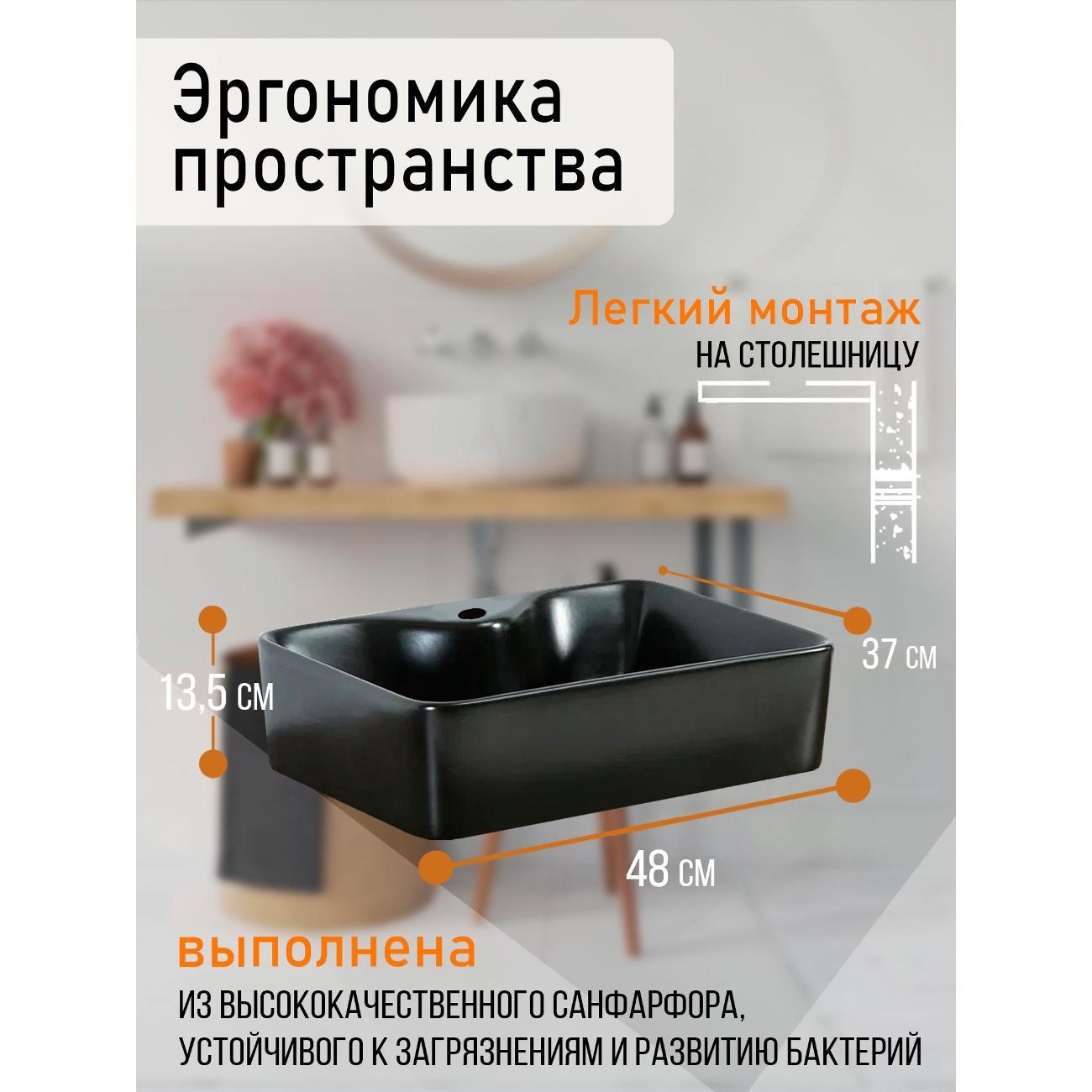 Orange B01-475mb Накладная раковина - это элегантное и практичное решение для ванной комнаты. Она прекрасно впишется в любой интерьер благодаря своему стильному дизайну. Данная модель отличается благородным черным матовым цветом и плавными линиями - прямоугольная форма с закругленными углами. Материал раковины фарфор отличается беспористой структурой, высокой прочностью и устойчивостью к различного рода загрязнениям и размножению бактерий, что позволит сохранить первоначальный вид изделия на долгие годы использования, гарантия от производителя 25 лет. С одним отверстием под смеситель, диаметр отверстия под смеситель - 35 мм, диаметр сливного отверстия - 45 мм. Устанавливается на столешницу, монтаж не требует специальных навыков. Смеситель и донный клапан приобретаются дополнительно.