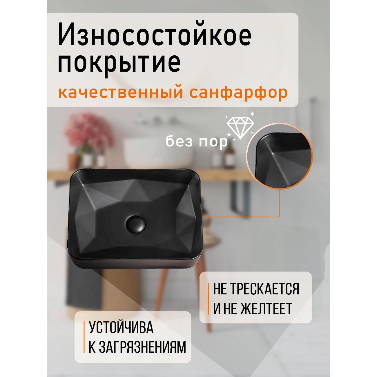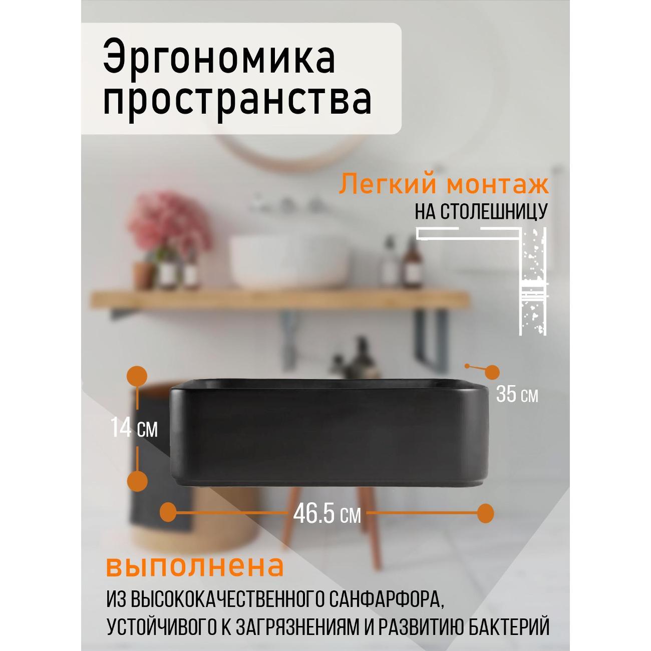 Orange B02-460mb Накладная раковина - это элегантное и практичное решение для ванной комнаты. Она прекрасно впишется в любой интерьер благодаря своему стильному дизайну. Данная модель отличается благородным черным матовым цветом и плавными линиями - прямоугольная форма с закругленными углами. Материал раковины фарфор отличается беспористой структурой, высокой прочностью и устойчивостью к различного рода загрязнениям и размножению бактерий, что позволит сохранить первоначальный вид изделия на долгие годы использования, гарантия от производителя 25 лет. Диаметр сливного отверстия - 45 мм. Устанавливается на столешницу, монтаж не требует специальных навыков. Донный клапан приобретается дополнительно.