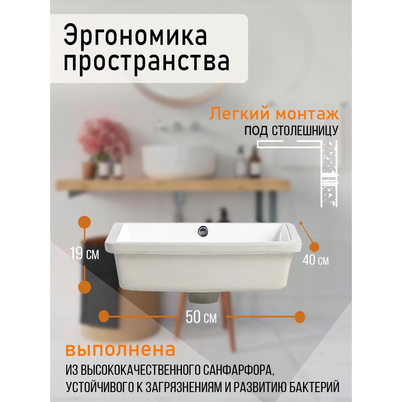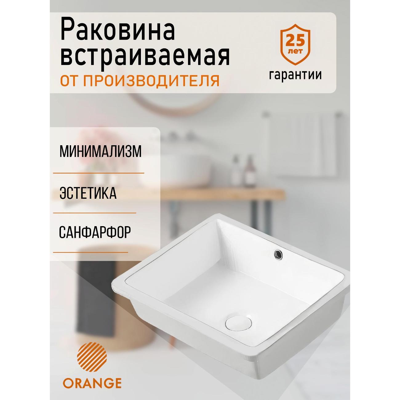 Orange B02-500W Встраиваемая снизу раковина - это элегантное и практичное решение для ванной комнаты. Она прекрасно впишется в любой интерьер благодаря своему стильному дизайну. Данная модель отличается благородным глянцевым белым цветом и четкими линиями - прямоугольная форма. Материал раковины фарфор отличается беспористой структурой, высокой прочностью и устойчивостью к различного рода загрязнениям и размножению бактерий, что позволит сохранить первоначальный вид изделия на долгие годы использования, гарантия от производителя 25 лет. Встроенный слив-перелив, диаметр сливного отверстия - 45 мм. Модель встраивается снизу в столешницу, монтаж не требует специальных навыков. Донный клапан приобретается дополнительно.