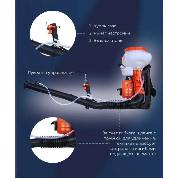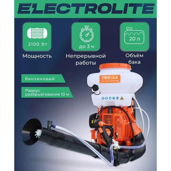 Ранцевый опрыскиватель Electrolite 3WF-2.6A, выполненный в пластиковом корпусе, работает на базе бензинового двигателя мощностью 1,8 кВт, который развивает максимальную скорость работы 7500 об/мин. Емкости топливного бака 1,4 л хватает на 3 часа беспрерывной работы. Жидкость заливается в отсек объемом 20 л, из которого она может разбрызгиваться на расстояние до 10 м. Максимальная скорость распыления достигает 182 л/час. Для упрощенной транспортировки опрыскивателя предусмотрены наплечные ремни, для снижения нагрузки во время работы используется защита от вибрации.