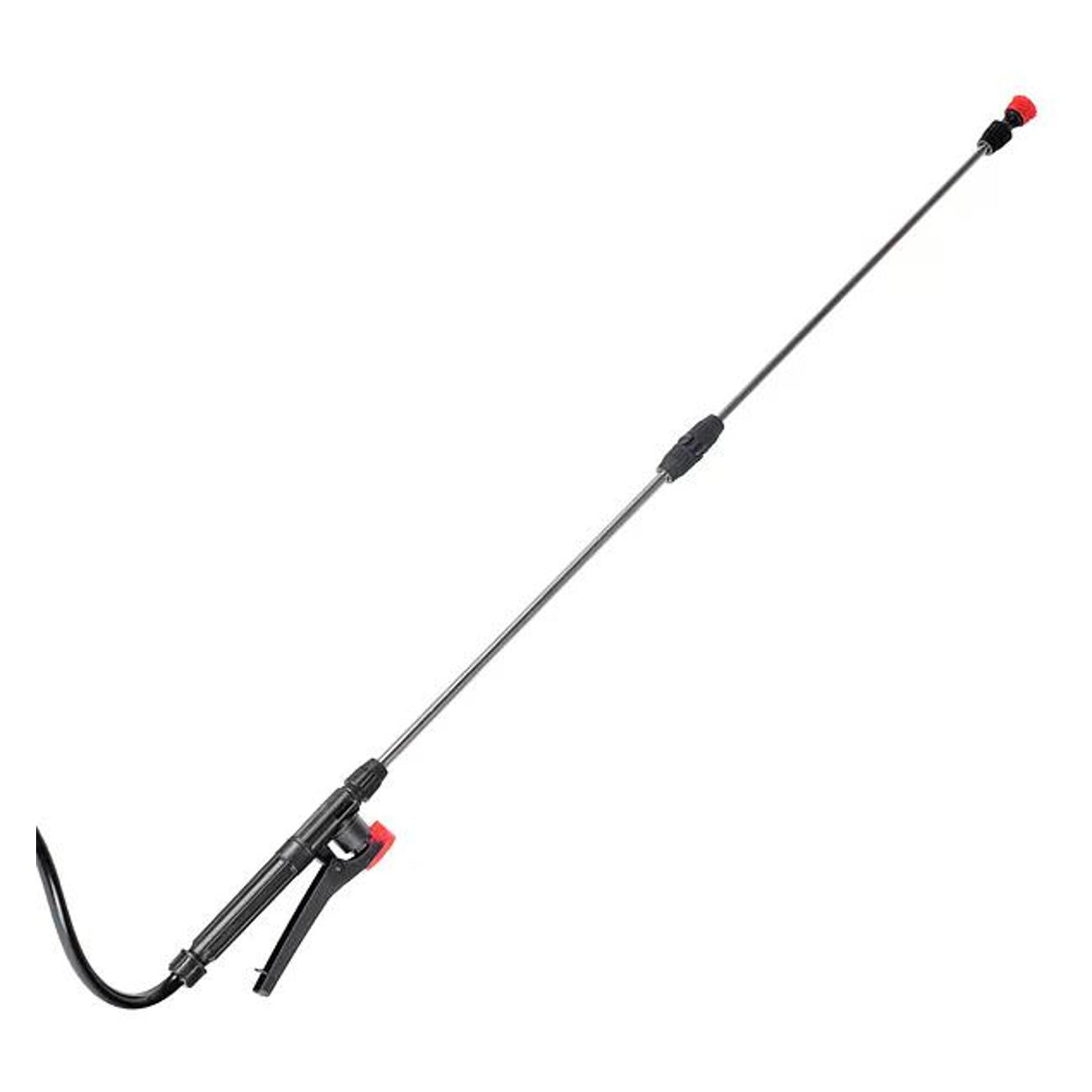 Бак объемом 10 л снабжен широкой горловиной, через которую удобно заливать жидкость. В комплект входят три форсунки разного размера. Шланг длиной 1,5 м и диафрагменный насос обеспечивают радиус распыления до 4 м. За питание отвечает аккумулятор емкостью 8 А*ч. Размеры опрыскивателя — 42х33х18 см, вес — 4,3 кг.