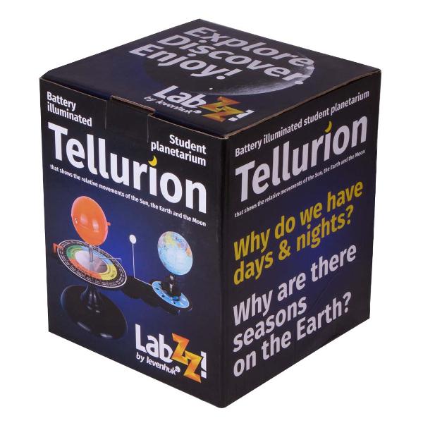 Прибор состоит из подставки и корпуса, соединенных между собой винтом. Земля вращается вокруг Солнца при помощи ручки, внутри светила расположена лампочка. Игрушка выполнена из пластика, работает от трех батареек LR41 (есть в комплекте). Теллурий содержит в себе мелкие детали, поэтому не рекомендуется оставлять детей до 5 лет с игрушкой без присмотра.