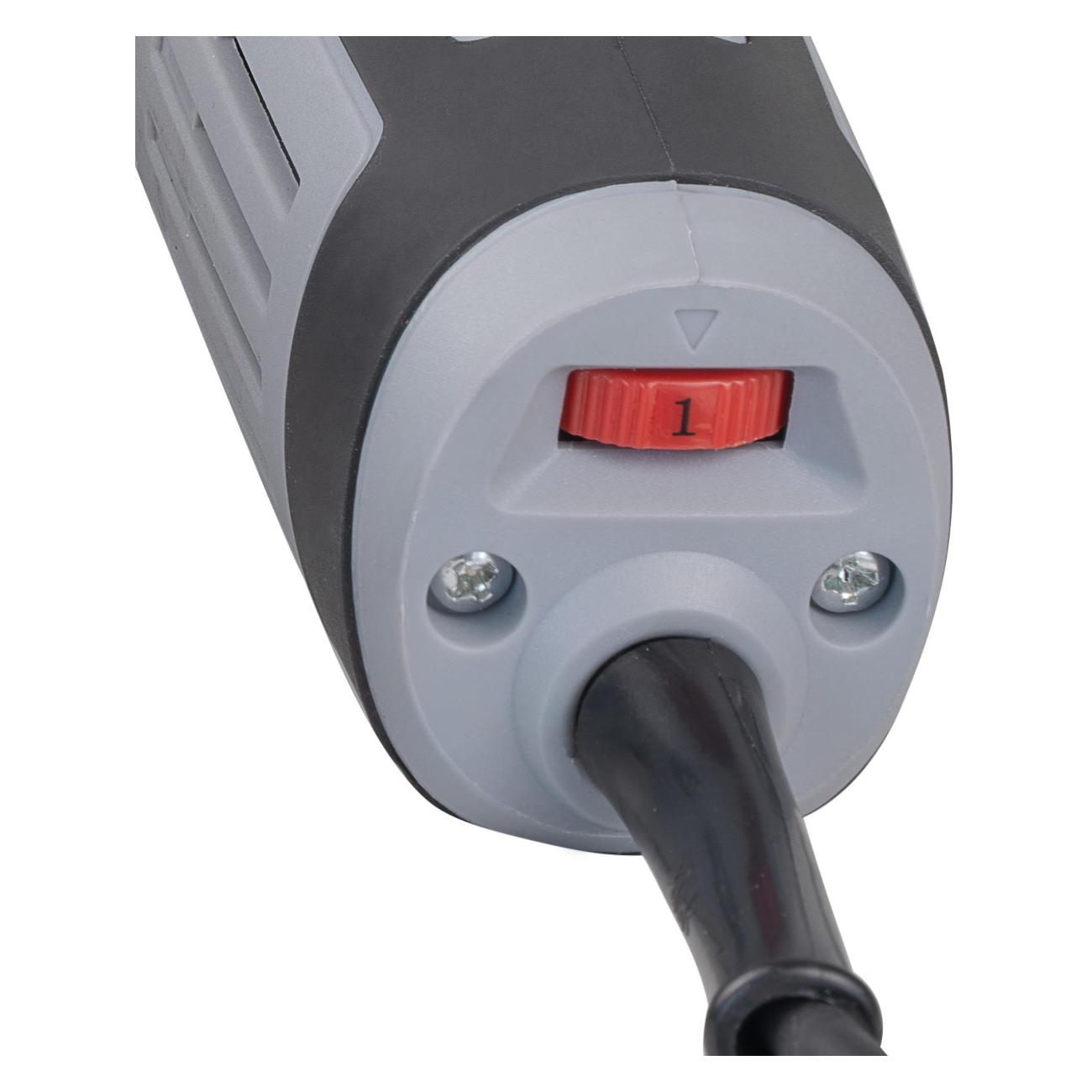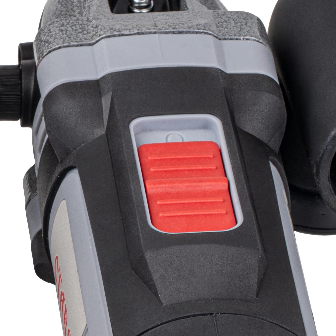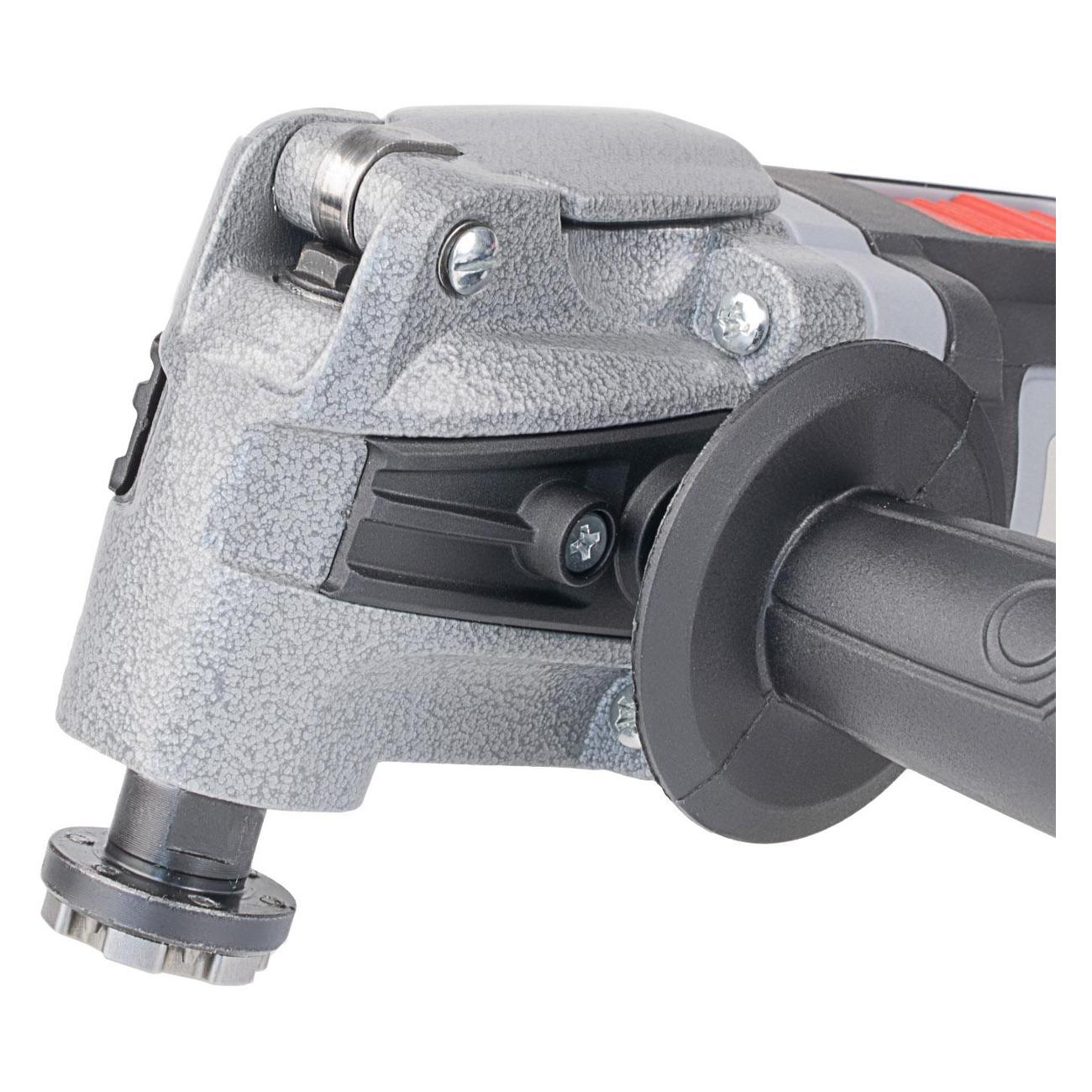 Угол колебаний составляет 3,5°, что делает работу с реноватором эффективной и комфортной. Устройство оснащено системой быстрой замены оснастки и фиксацией шпинделя. Также предусмотрен патрубок для подключения строительного пылесоса. Корпус реноватора выполнен из металла и пластика. Длина сетевого кабеля —