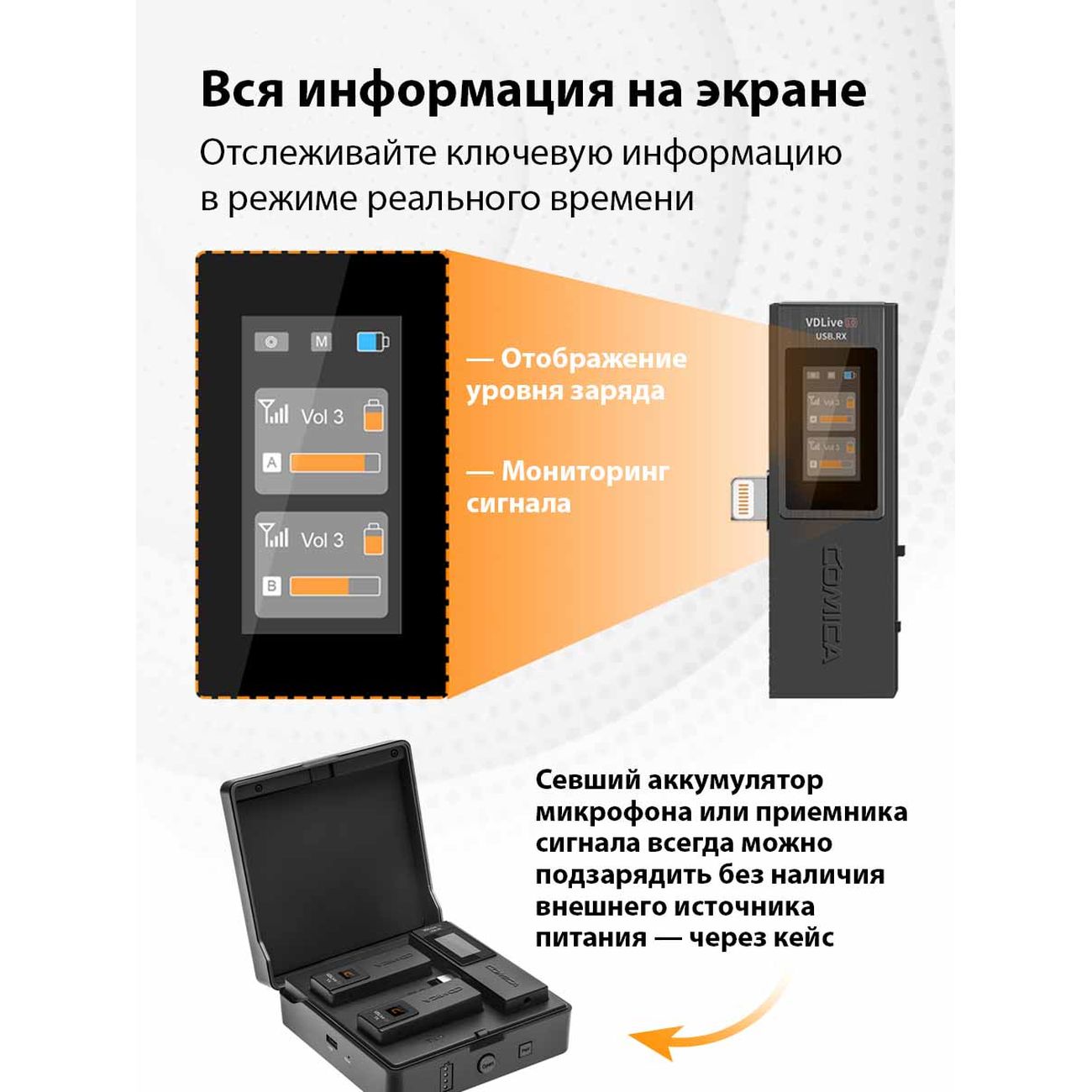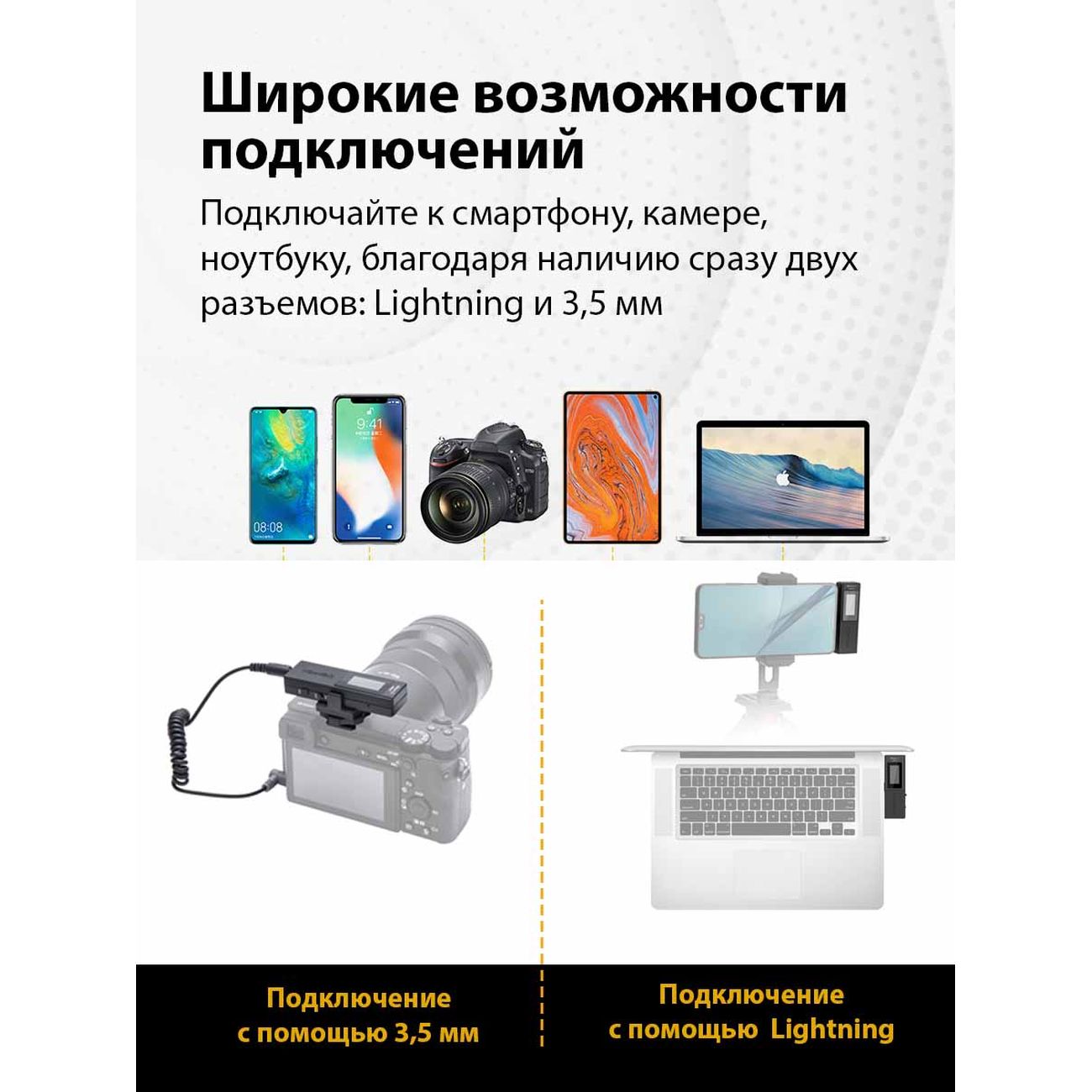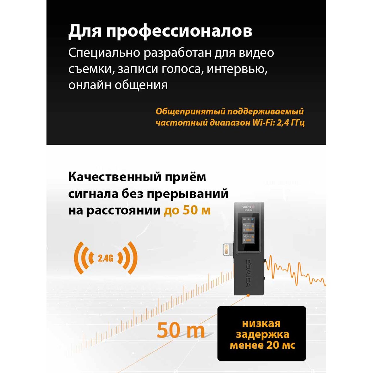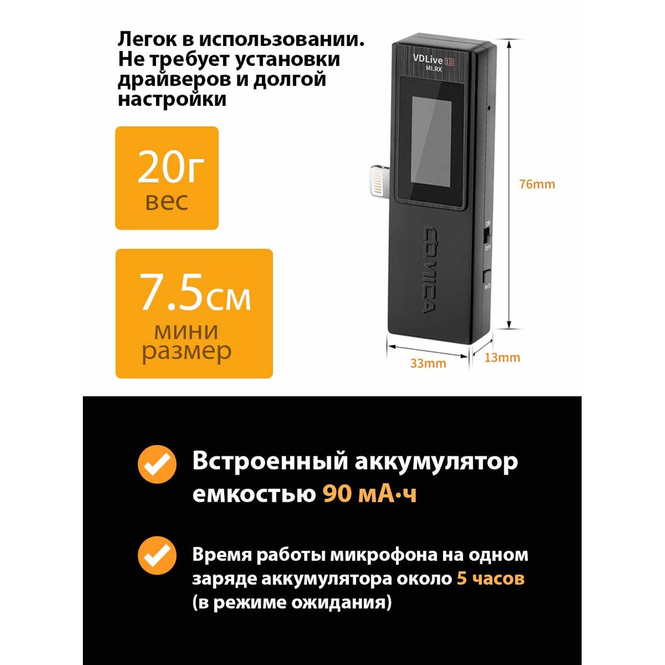 Ресивер CoMica VDLive10 MI RX Black передает аудио со смартфона, компьютера, камер, поддерживающих ОС IOS в реальном времени. Прибор может работать на расстоянии до 50 м от устройства. Модель функционирует от аккумулятора, емкости которого хватает на 5 ч непрерывной работы. Яркий дисплей отображает состояние подключение к устройствам и расход батареи. Встроенный микрофон позволяет делать запись без лишнего шума и помех. Выключатель расположен на корпусе. За счет маленького размера 95х35х95 мм и легкого веса 21 г прибор удобен в транспортировке и эксплуатации.