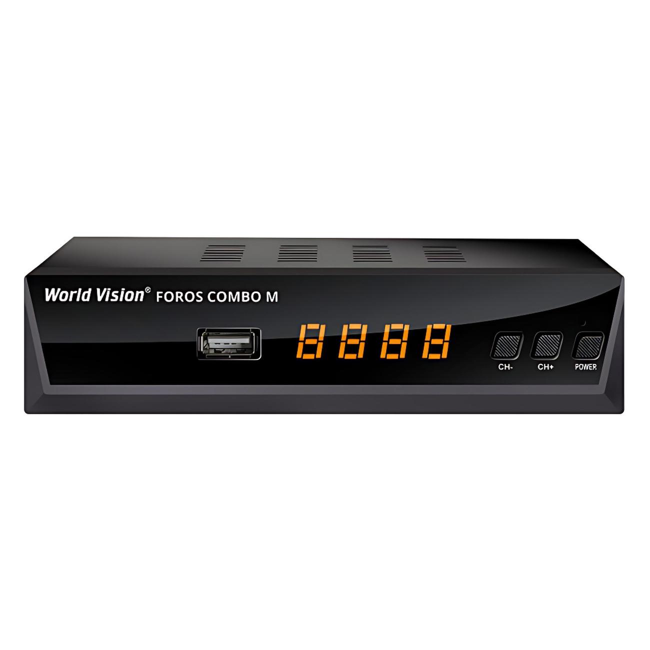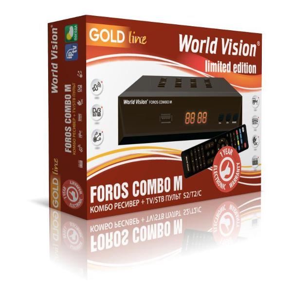 Ресивер World Vision Foros Combo M с наибольшим разрешением 1920x1080 пикселей (Full HD) поддерживает регистрацию ТВ на USB-устройство, Wi-Fi, TimeShift, электронный телегид, воспроизведение медиафайлов с электронных носителей. Устройство воспроизводит телетекст и субтитры, обеспечивает возможность приема спутниковых транспондеров T2MI. Программное обеспечение обновляется через USB и интернет.