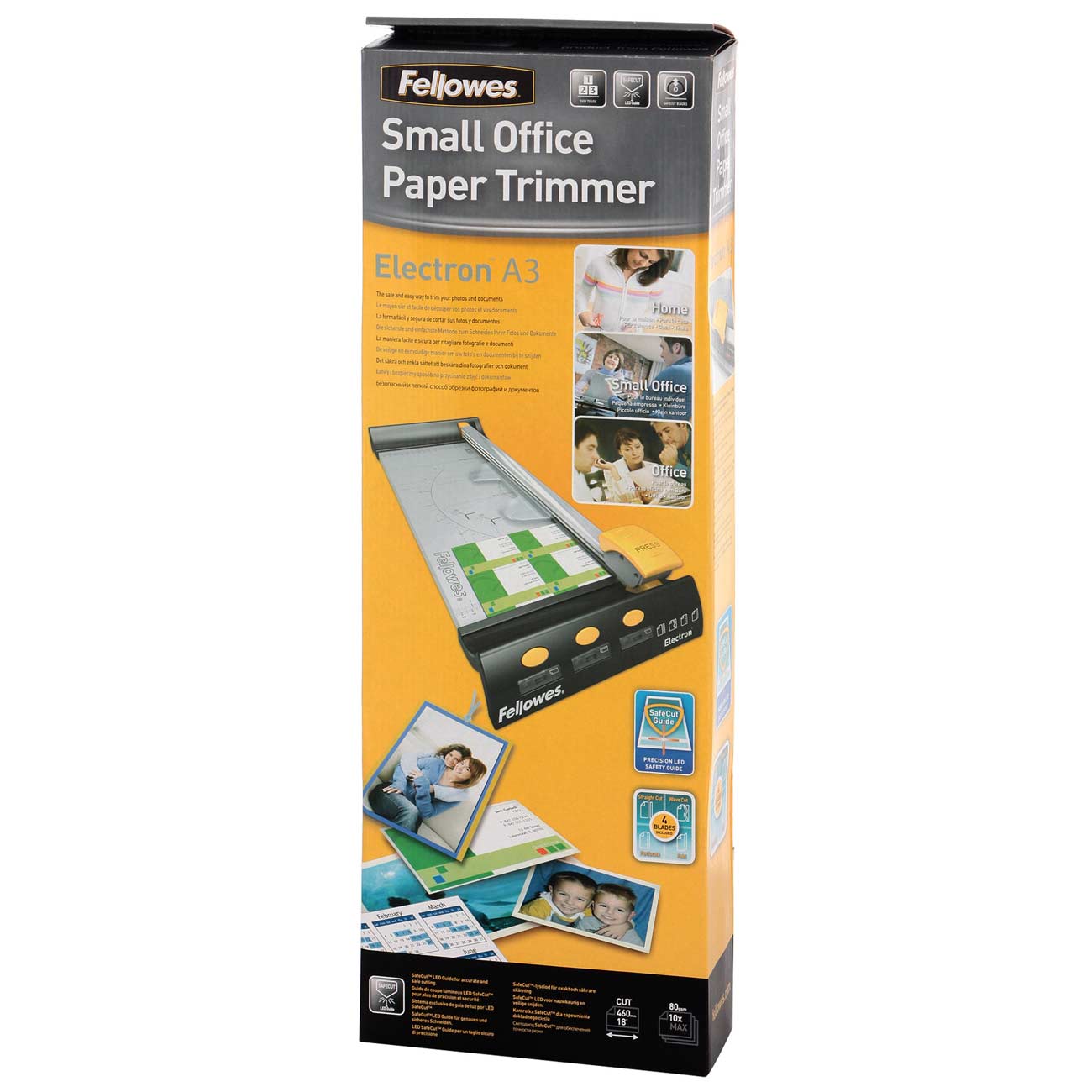 Fellowes Electron A3 – офисный резак дискового типа. Эта модель, оборудованная надёжной автоматической системой прижима, легко справится со стопкой толщиной до десяти листов, а также с плёнкой либо фотографиями. Световой указатель показывает линию, на которую опустится нож. Благодаря этому пользоваться устройством особенно просто и безопасно.