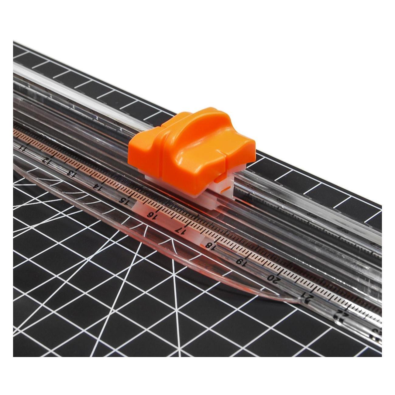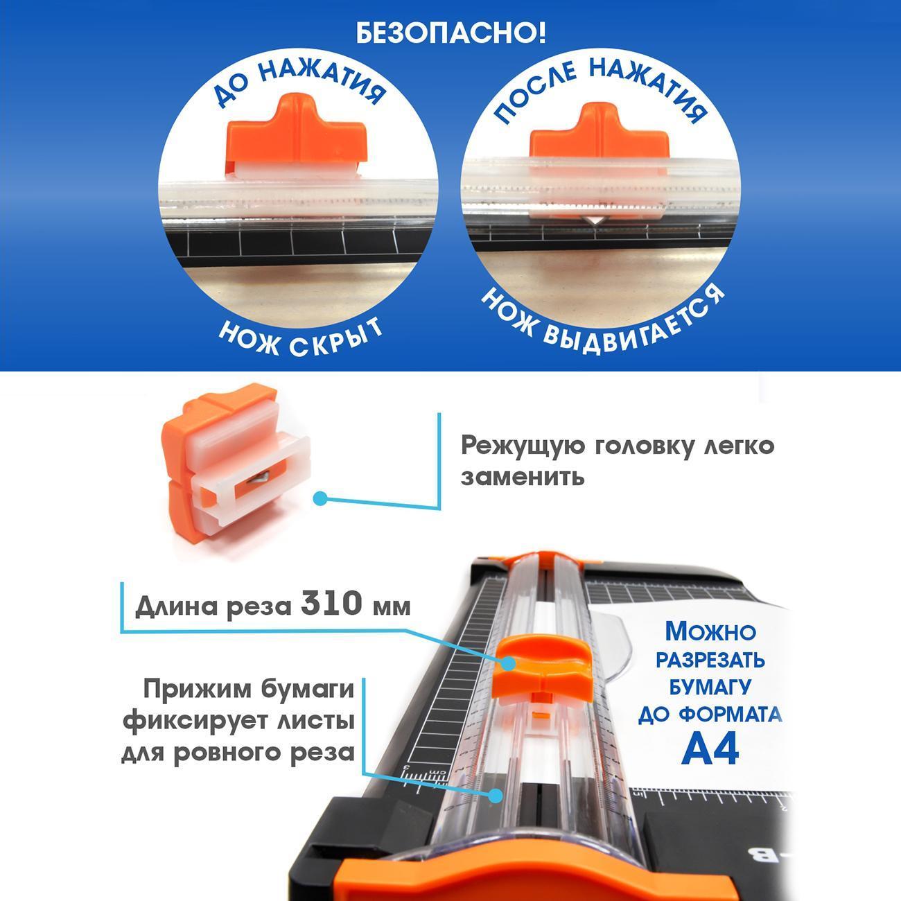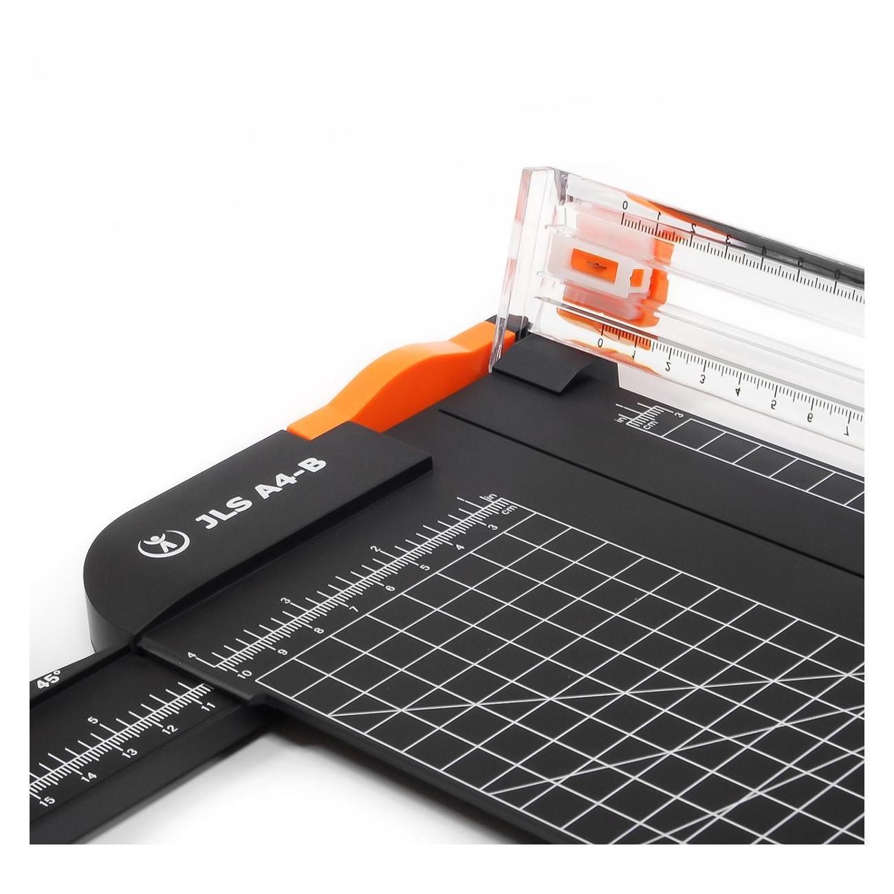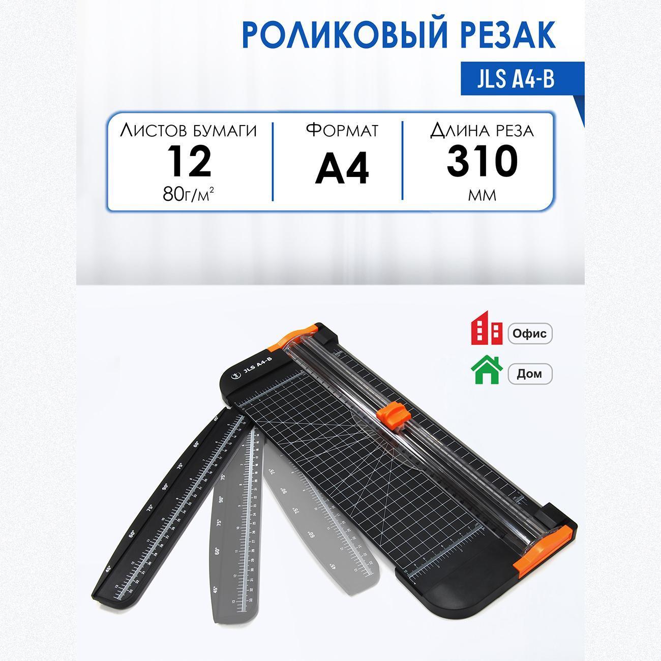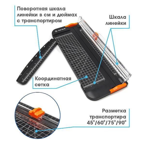 Компактный и удобный резак для бумаги формата А4 - JLS А4-B:- точный рез обеспечит разметка рабочего стола, линейка на выдвигающейся поворотной планке и линейка на прозрачной направляющей;- линии транспортира позволят Вам точно резать бумагу под углами 45/60/75/90 градусов;- если режущая головка затупилась ее легко заменить;- резак компактен и не займет много места. Подойдет для дома и офисов с небольшим объемом работ.