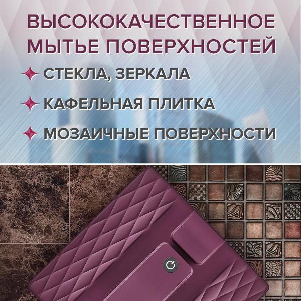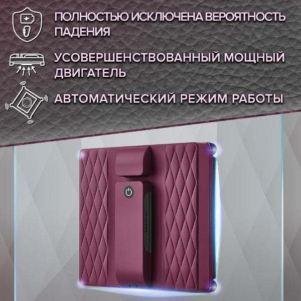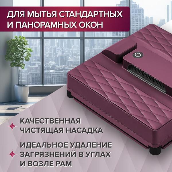 Робот-стеклоочиститель «Даджет» R100, бордовый эффективно очищает окна, зеркала, кафельную плитку, мозаичные панно. Благодаря квадратной форме он качественно обрабатывает даже труднодоступные углы и участки около рам. Уборка 1 м² занимает всего 3,5 минуты. Режимов работы три: «Автоматический», «Горизонтальное окно» и «Вертикальное окно», выбор параметров сопровождается звуковыми сигналами. За управление отвечает дистанционный пульт.