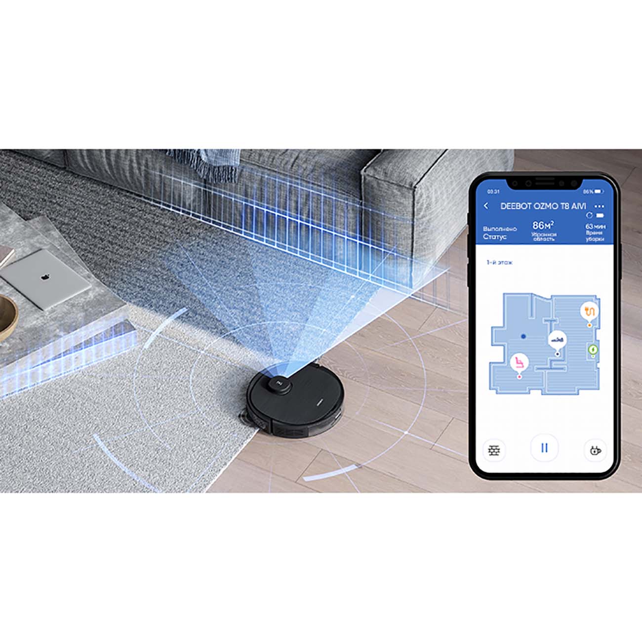 Модель оснащена усовершенствованной системой преодоления препятствий, которая, между прочим, постоянно обновляется. Устройство не просто объезжает большие и маленькие предметы, но и понимает, что именно лежит на пути: будь то коробка или носок. Благодаря особенностям встроенного лазера DToF прибор замечает не только объекты в области сканирования, но и ниже неё, то есть вам не нужно будет приподнимать шторы и сматывать провода.