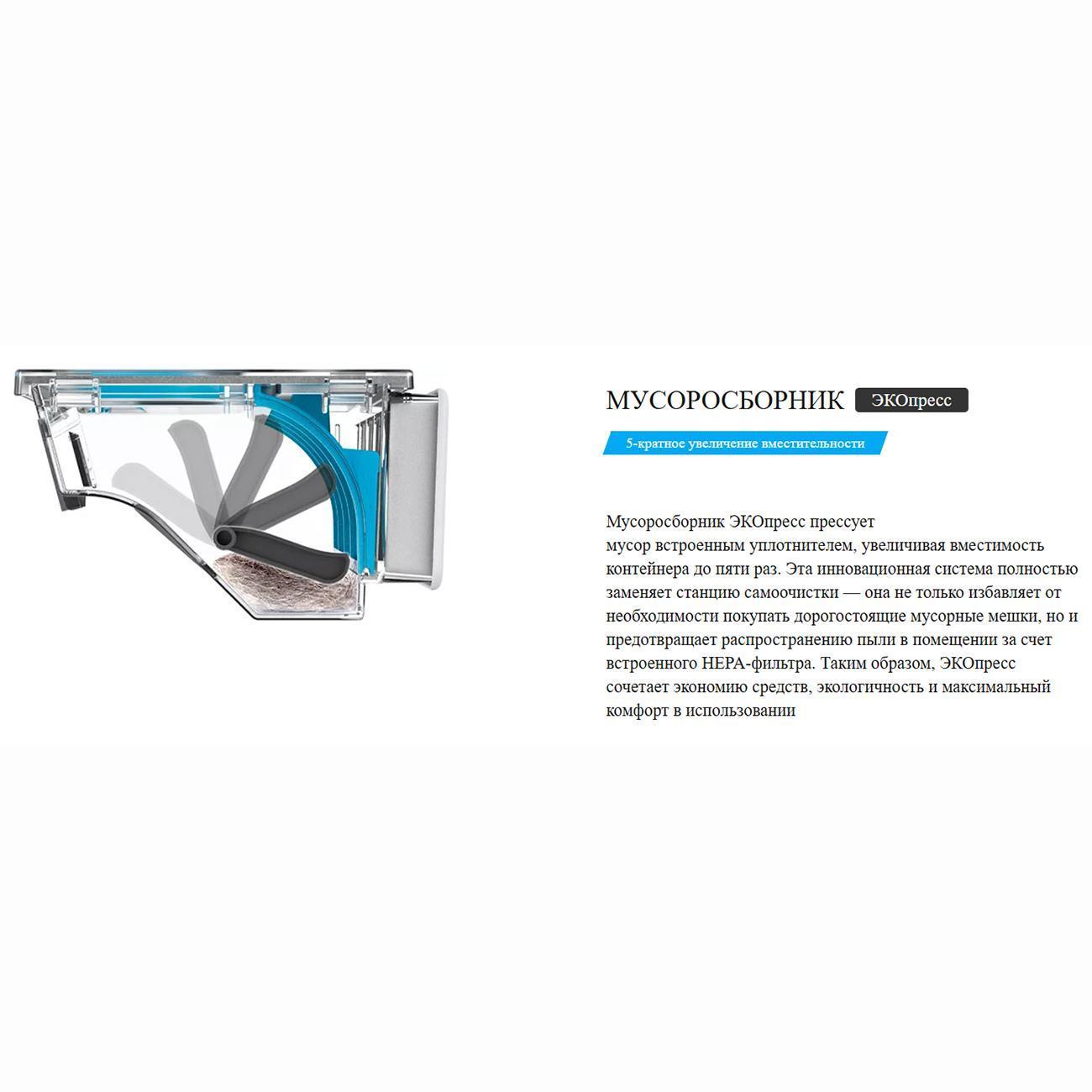 Встроенный механизм уплотняет собранную пыль, увеличивая полезный объем контейнера в пять раз. Это позволяет реже опустошать бак и заменяет громоздкую станцию самоочистки мусора, экономя пространство и расходные материалы.