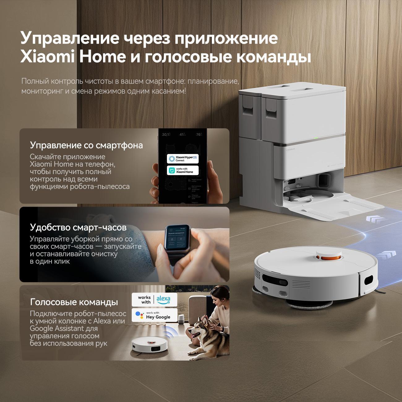 Устройство поддерживает управление через приложение Mi Home для ОС Android и iOS, можно настраивать таймер включения на каждый день недели, выбирать режимы работы и отслеживать процесс уборки. Голосовое управление доступно через помощников Alexa и Google.