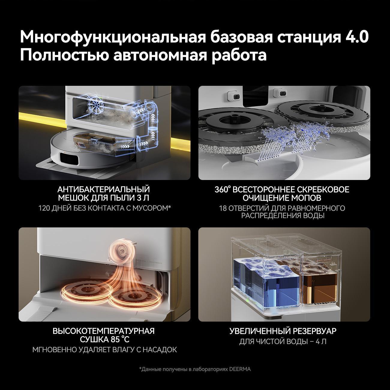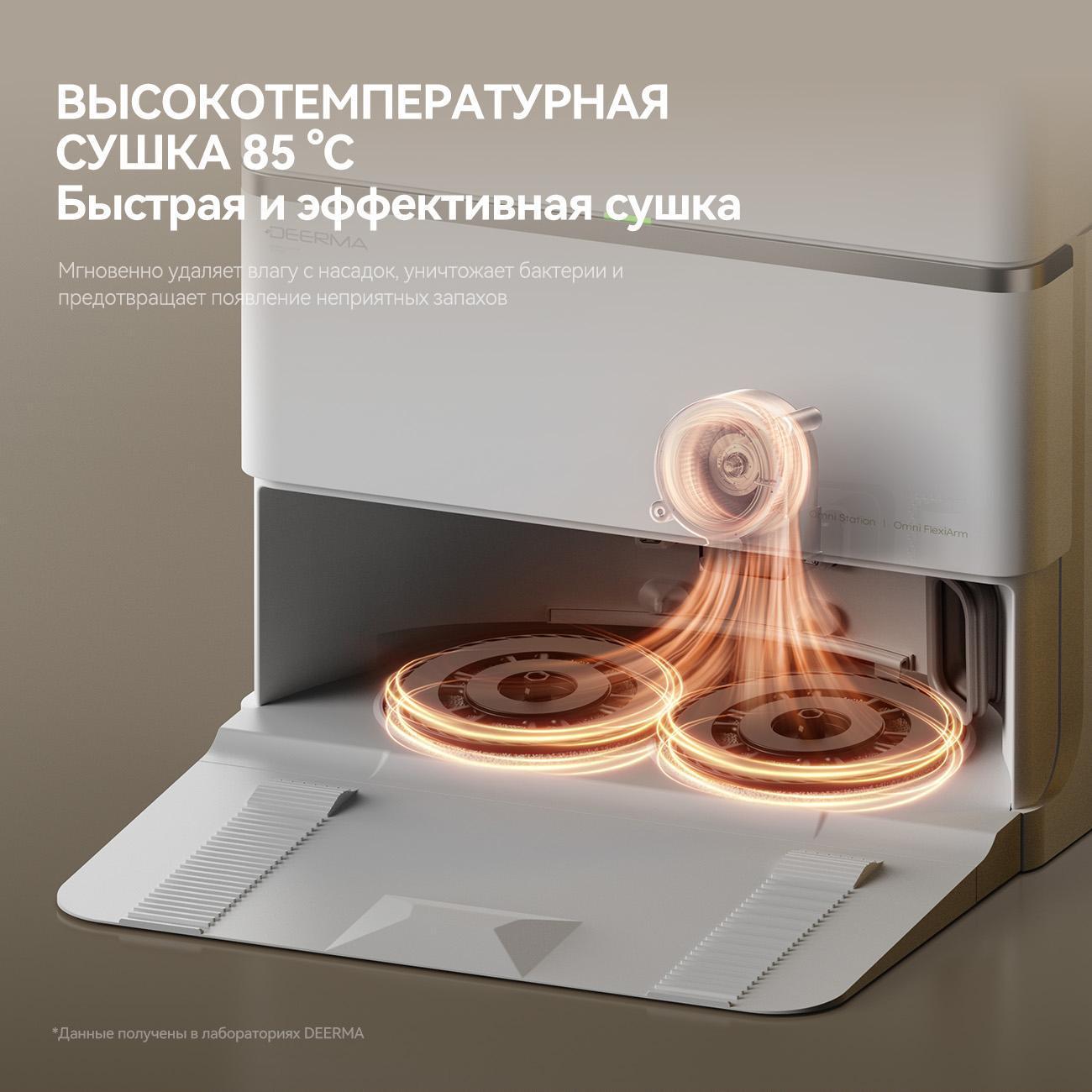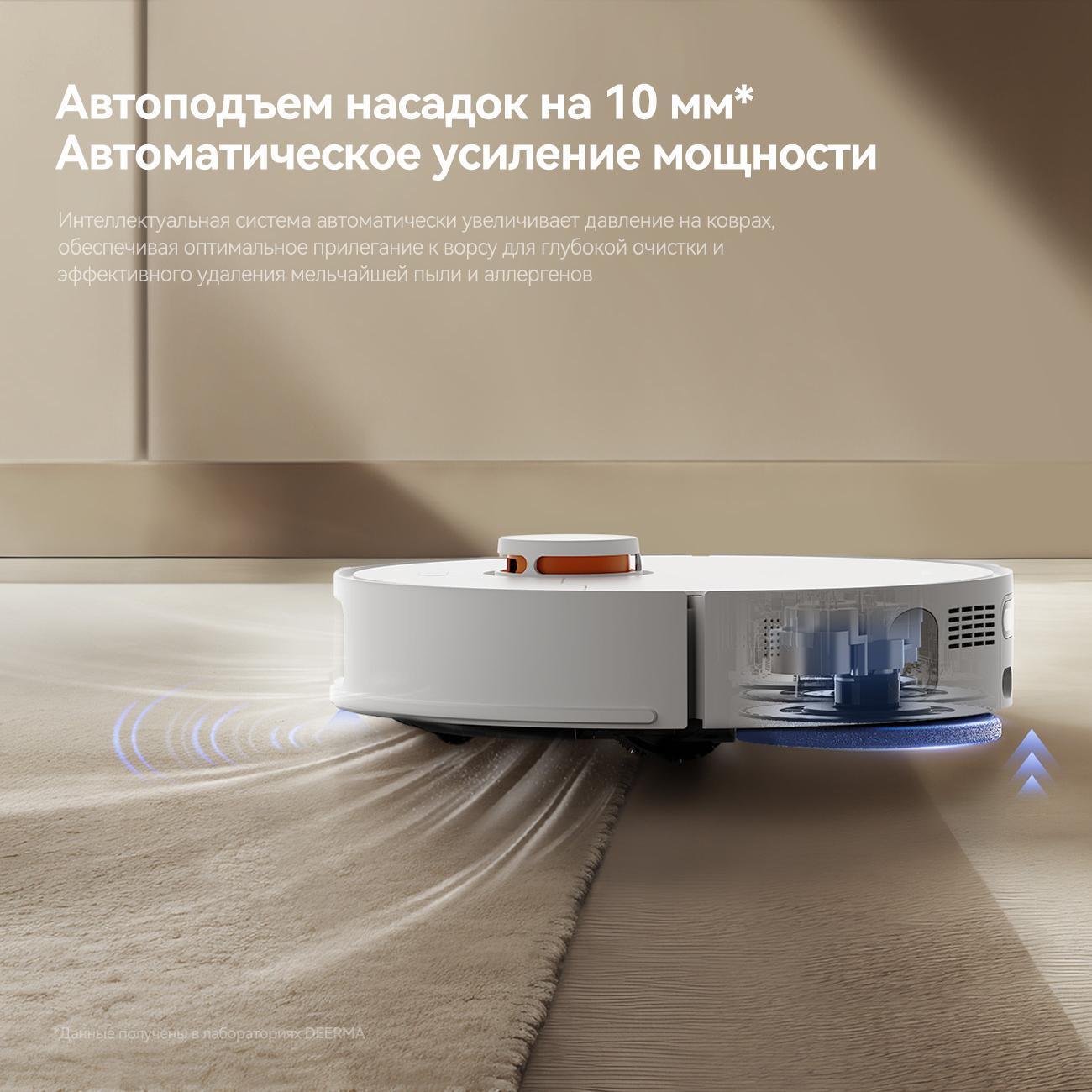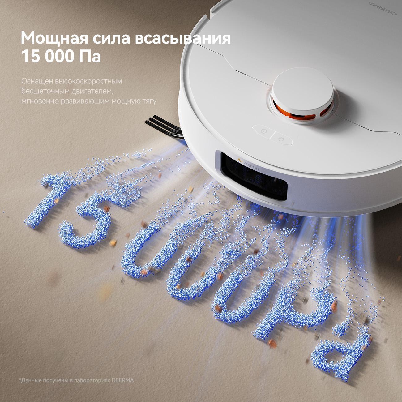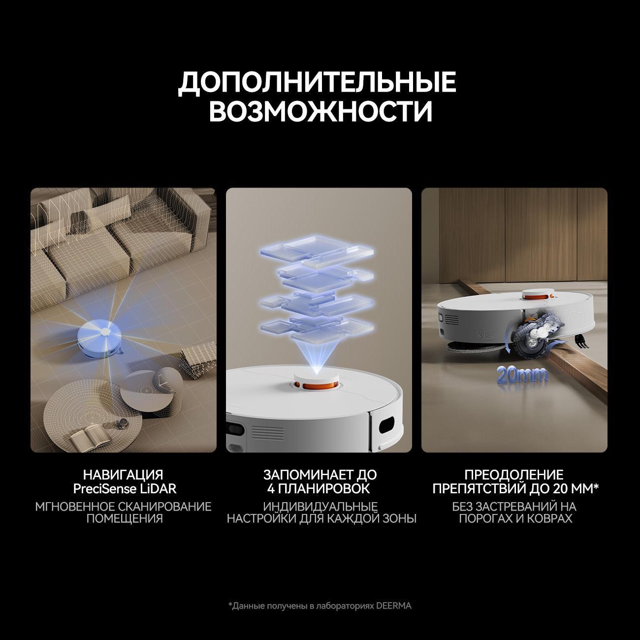 Робот-пылесос с базой очистки Deerma DEM-X80 в белом пластиковом корпусе выполняет комплексную сухую и влажную уборку помещений площадью до 300 м². Навигация на основе лазерного лидара позволяет точно строить план помещения и эффективно планировать маршрут.