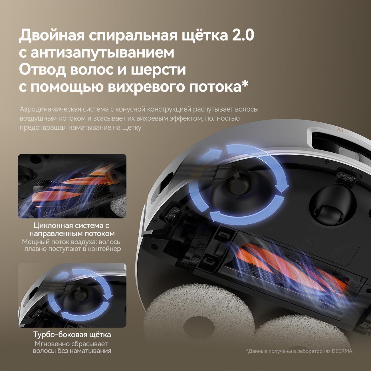 Робот-пылесос функционирует до 240 минут от аккумулятора емкостью 5200 мА*ч, автоматически возвращается на зарядку при критическом снижении ресурса. Мощность всасывания 15000 Па обеспечивает эффективную сухую уборку, функция влажной уборки осуществляется через вращающиеся насадки. В комплекте — боковая щетка, HEPA-фильтр и семь насадок.