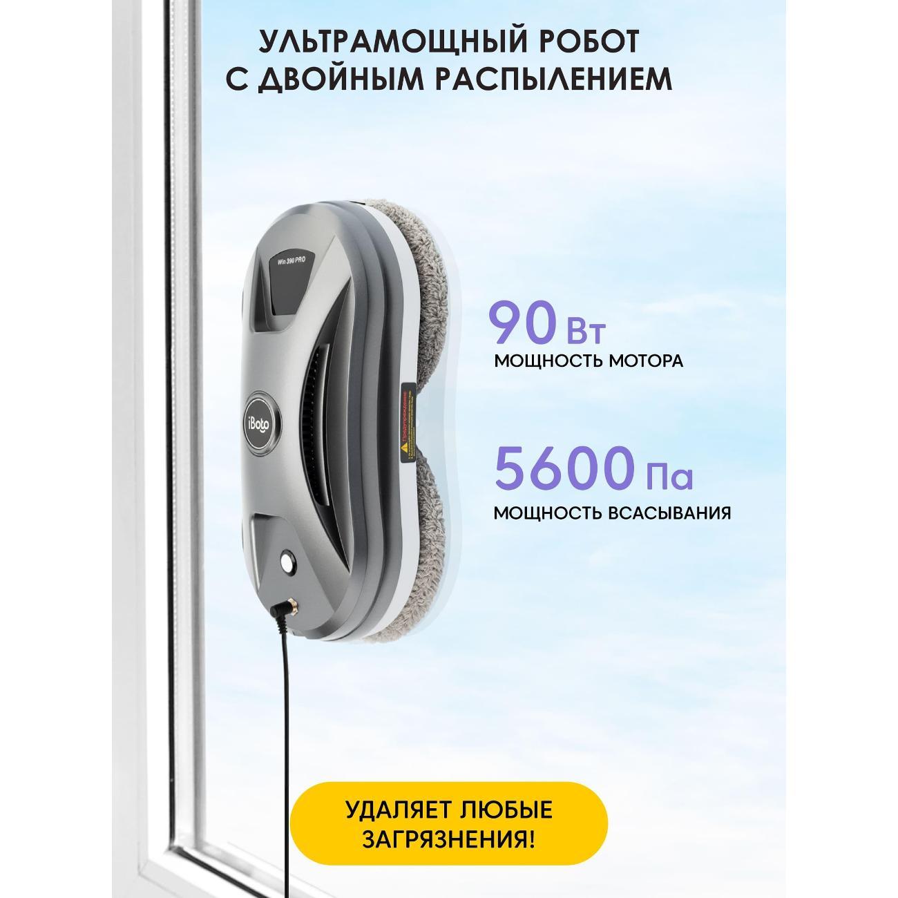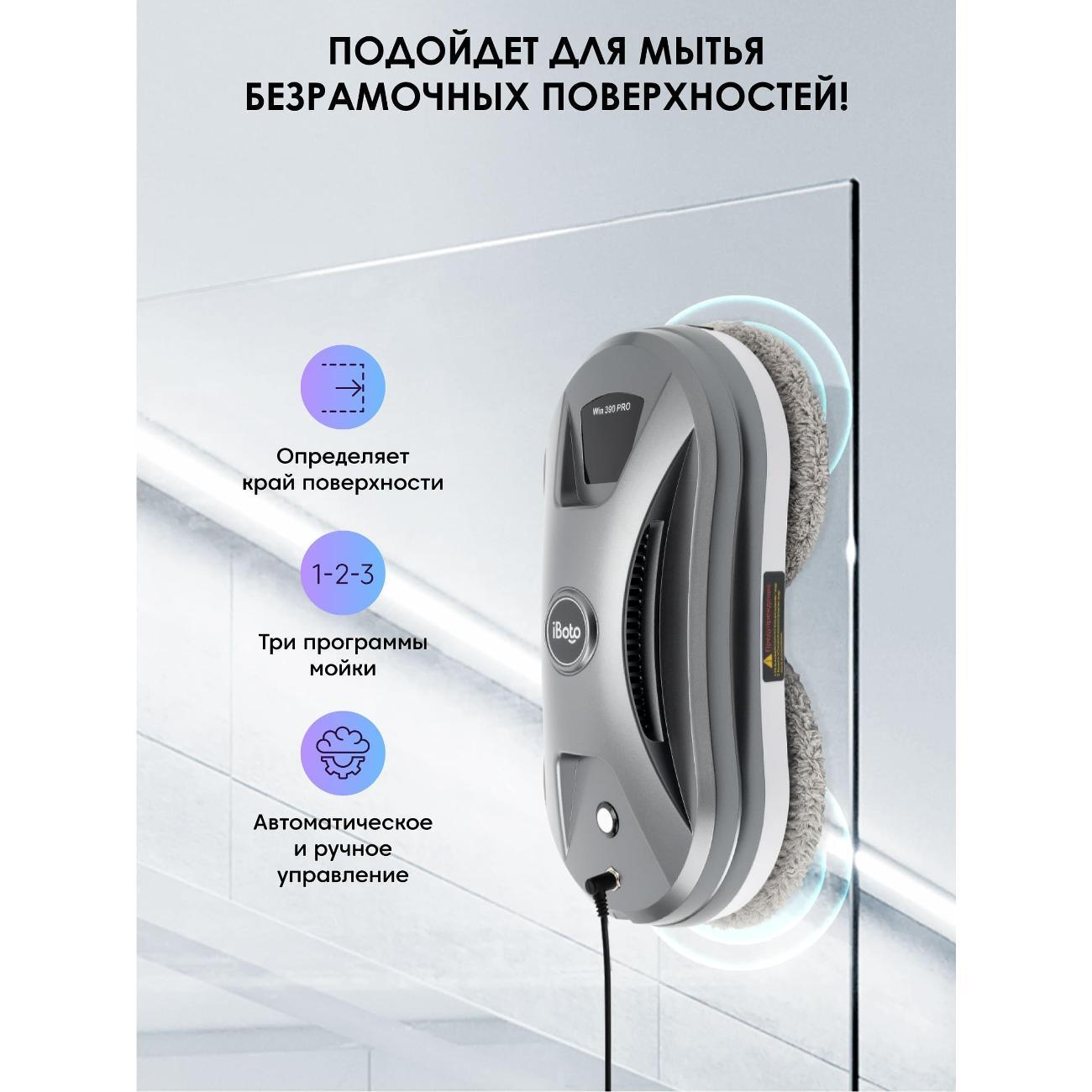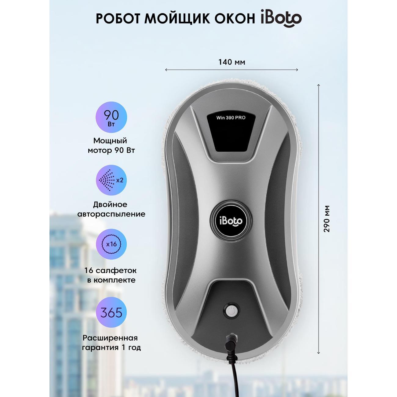 Робот мойщик окон iBoto Win 390 PRO iBoto работает в 3-х режимах, идеально подходит для безопасного мытья окон и зеркал.• Устройство справляется с мойкой окон на высоте от 30 см• Мощный бесщеточный мотор 90 Вт и высокая сила всасывания 5600 Па делают процесс в два раза быстрее• Функция двойного автораспыления обеспечивает оптимальное увлажнение с обеих сторон• Встроенный искусственный интеллект строит оптимальный маршрут уборкиВ комплекте 16 микрофибровых салфеток. Управление осуществляется через пульт или мобильное приложение iBoto. Устройство надежно крепится к любой поверхности благодаря мощному вакууму и страховочному тросу. Общая длина троса составляет 7.5 м, а встроенный аккумулятор обеспечивает резервное питание на 30 минут.