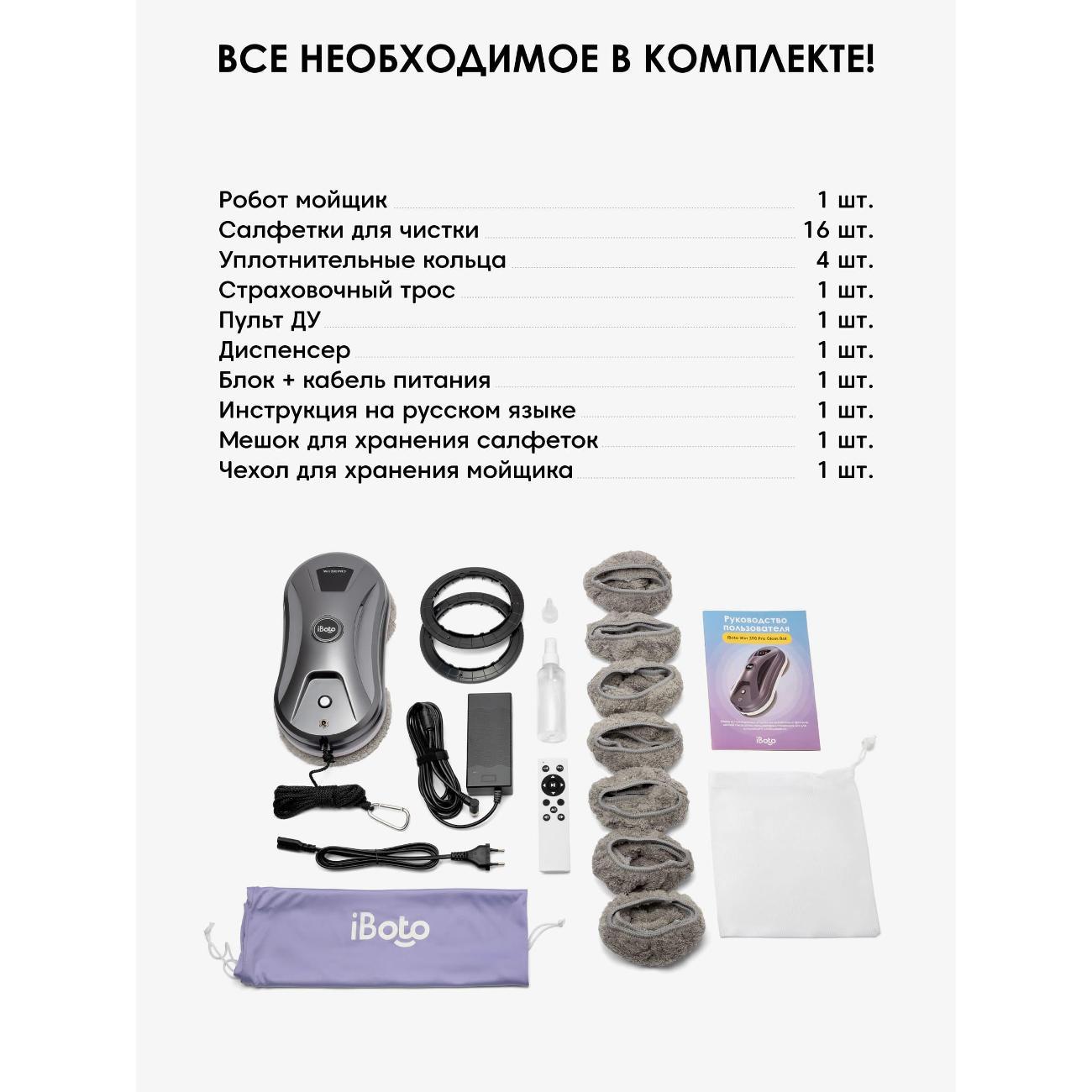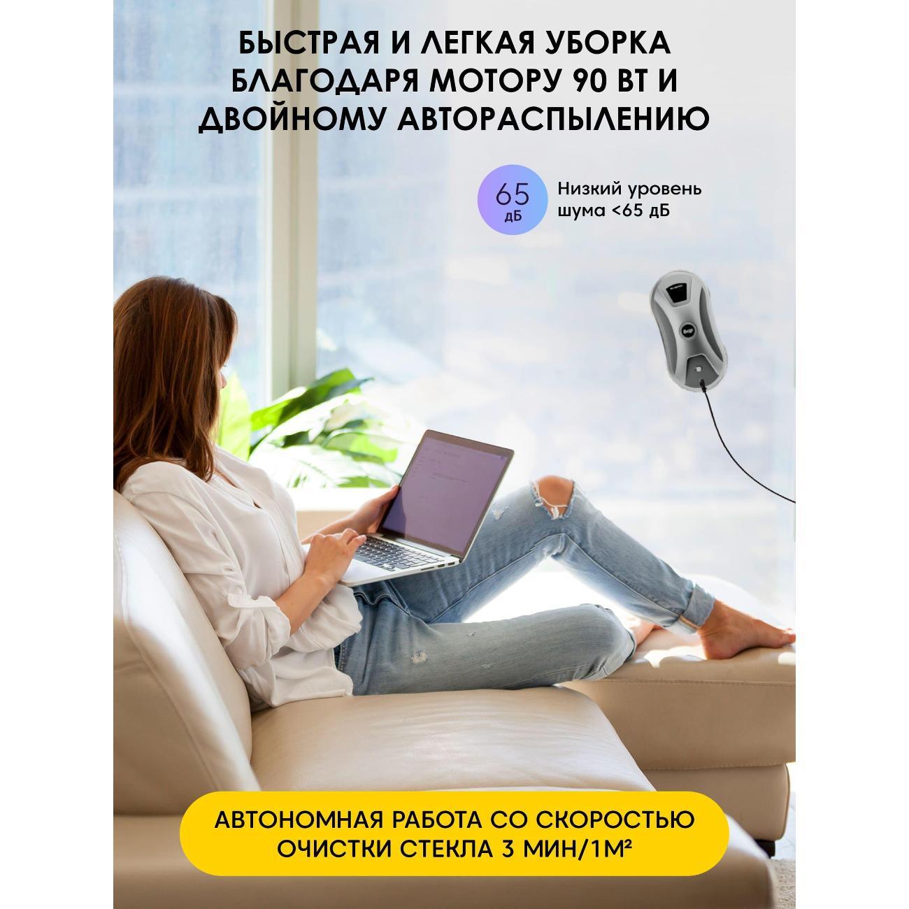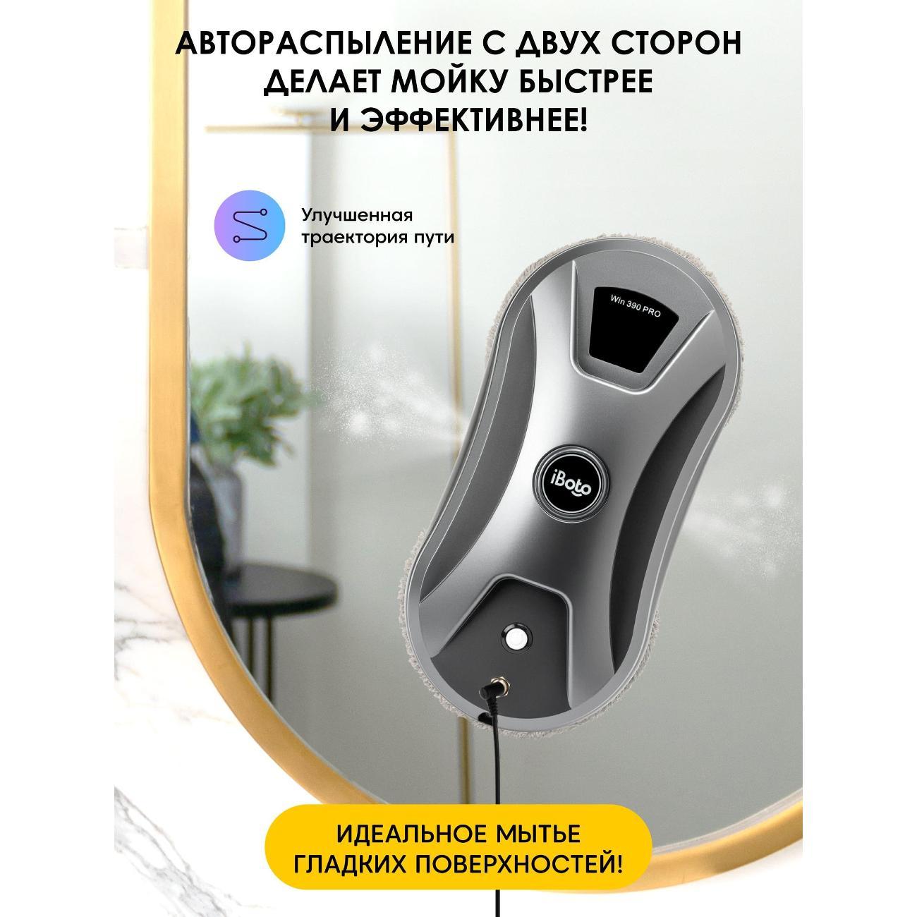 Робот мойщик окон iBoto Win 390 PRO iBoto работает в 3-х режимах, идеально подходит для безопасного мытья окон и зеркал.• Устройство справляется с мойкой окон на высоте от 30 см• Мощный бесщеточный мотор 90 Вт и высокая сила всасывания 5600 Па делают процесс в два раза быстрее• Функция двойного автораспыления обеспечивает оптимальное увлажнение с обеих сторон• Встроенный искусственный интеллект строит оптимальный маршрут уборкиВ комплекте 16 микрофибровых салфеток. Управление осуществляется через пульт или мобильное приложение iBoto. Устройство надежно крепится к любой поверхности благодаря мощному вакууму и страховочному тросу. Общая длина троса составляет 7.5 м, а встроенный аккумулятор обеспечивает резервное питание на 30 минут.