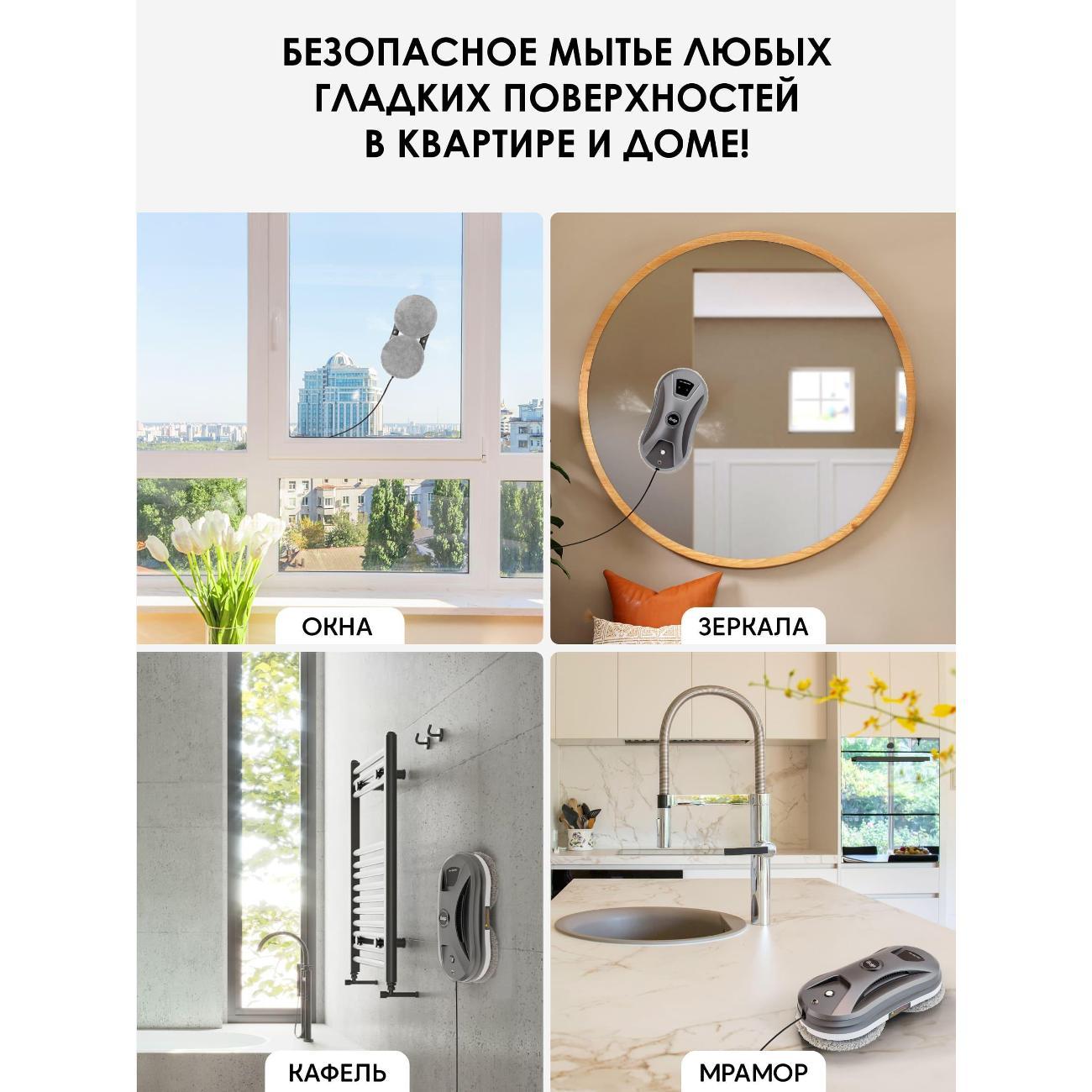 отлично справляется как с уличными окнами,так и с домашними зеркалами.Работает тише,чем другие роботы-мойщики.