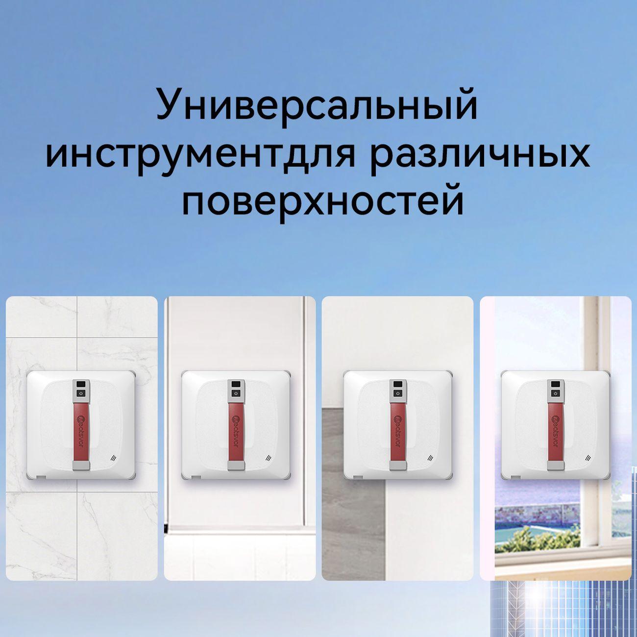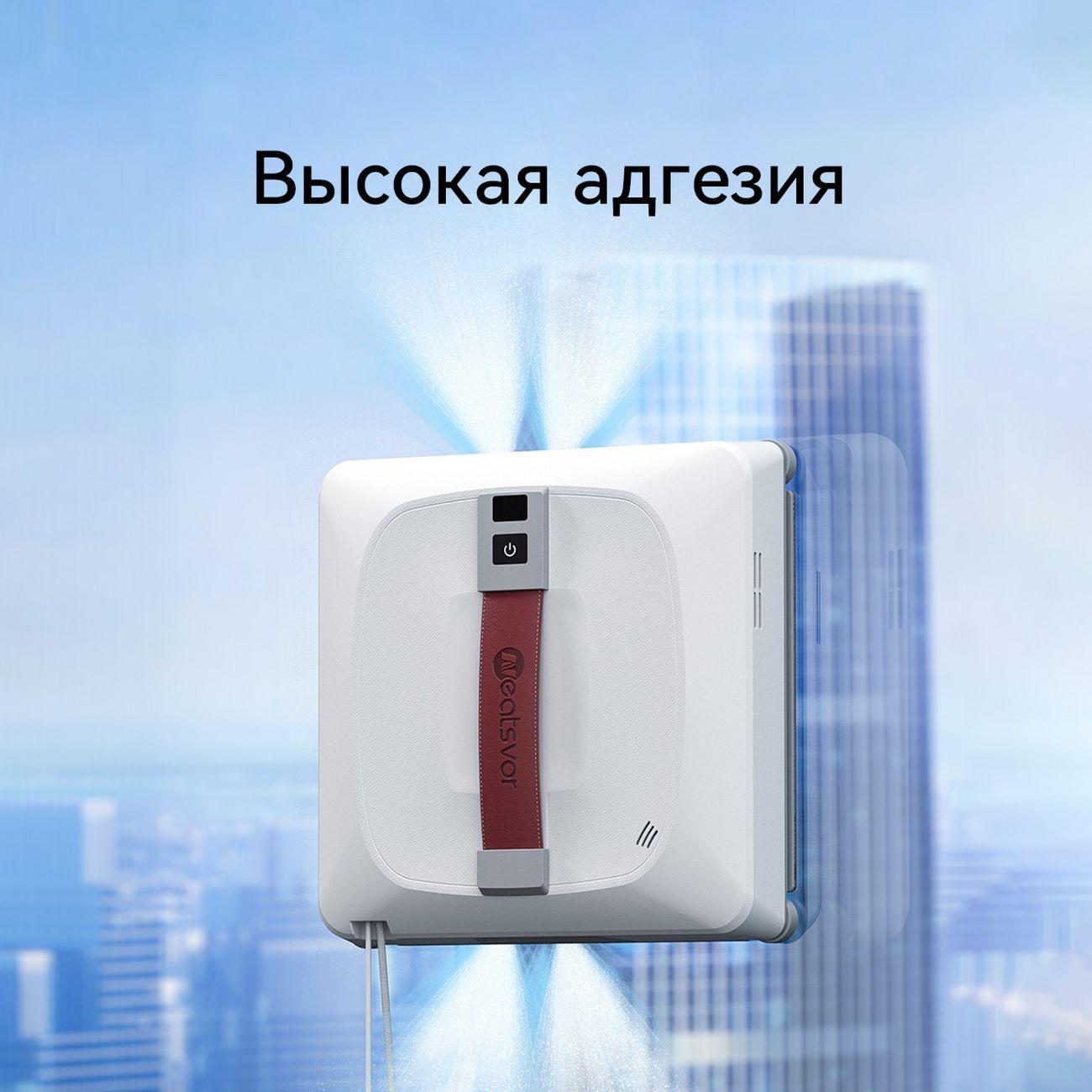 Робот-стеклоочиститель Neatsvor Window cleaning robot A2 силой всасывания 2,8 кПа оснащен технологией адгезии, которая обеспечивает надежное сцепление с вертикальными и горизонтальными поверхностями. Прибор очищает стеклянные, керамические и зеркальные поверхности в жилых и офисных помещениях со скоростью 1 м² в 4 минуты, позволяет обрабатывать фасады зданий. Прижим к поверхности осуществляется за счет вентилятора, расположенного в центральной части тыльной панели.