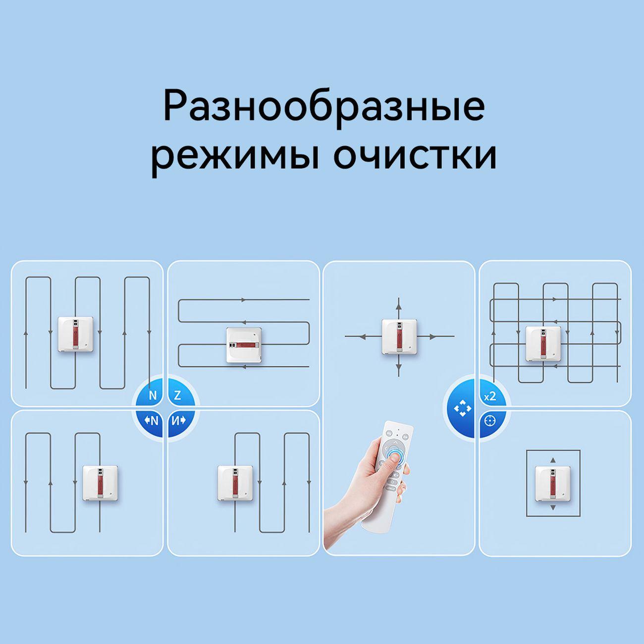 Прибор движется по следующим траекториям: N-образная; Z-образная; очистка левой зоны в N-форме; очистка правой зоны в N-форме; точечная очистка; очистка вверх, вниз, влево и вправо до конца стекла; глубокая очистка N и Z. Маршруты позволяют адаптировать устройство для очистки поверхностей сложной формы.