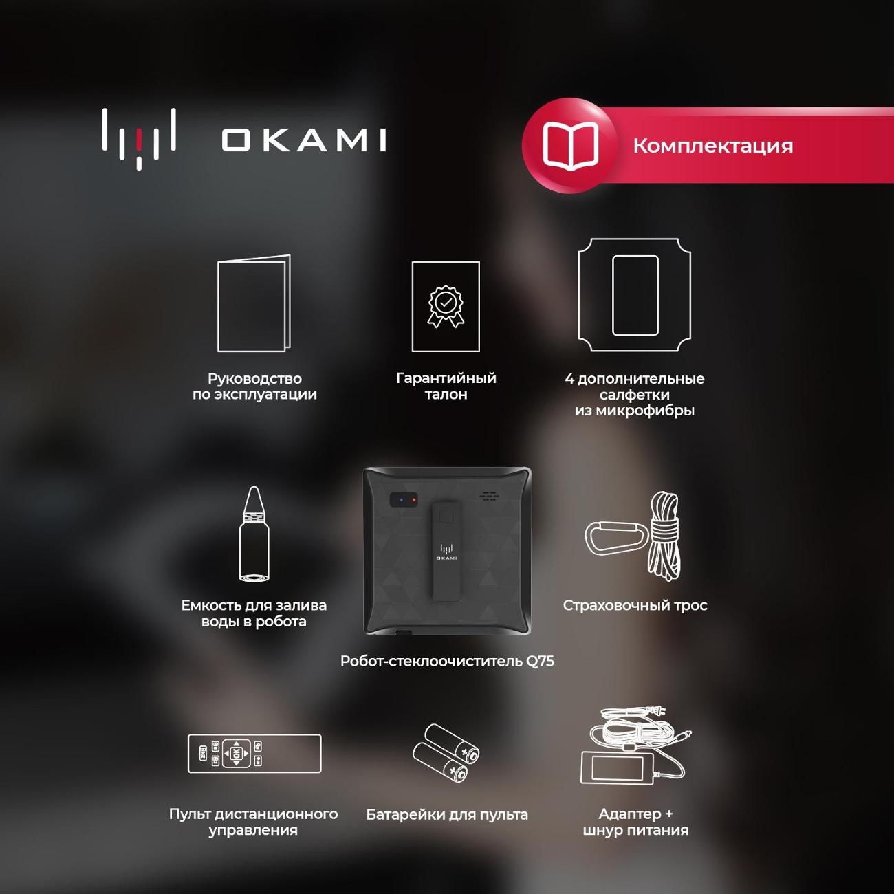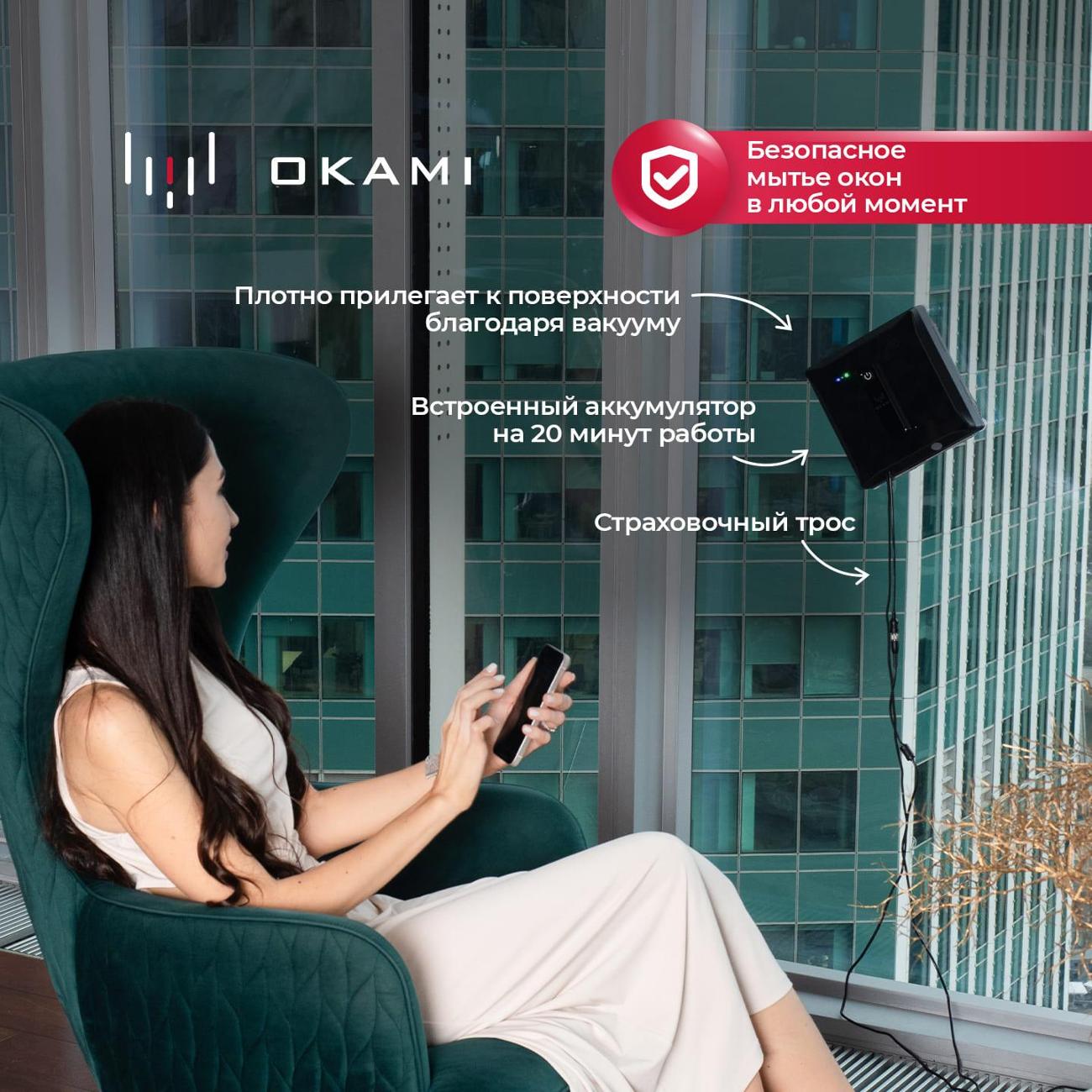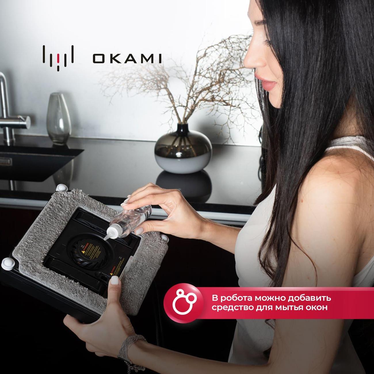 После фиксации робота на поверхности устройство самостоятельно ориентируется в пространстве с помощью технологии искусственного интеллекта. В процессе очистки робот распыляет моющее средство и собирает его с помощью салфетки, таким образом очищая поверхность от пыли и грязи. Один квадратный метр поверхности Okami Q75 очищает за 4 минуты. Квадратная форма позволяет мойщику эффективно очищать окна в углах и по краям.